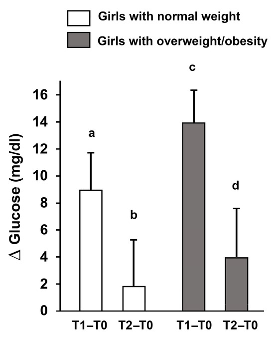 Changes in fasting glucose (Δ) after acute high-intensity intermittent exercise. Delta changes in fasting glucose levels immediately post-exercise (T1–T0) and 30 min post-exercise (T2–T0) in adolescent girls with normal weight and overweight/obesity. Data are presented as mean ± S.D. Different letters indicate significant differences between groups or time points according to Bonferroni post hoc tests (p < 0.05).