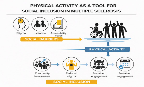 Marzoli, F.; Cardinali, L.; Di Pinto, G.; Campanella, M.; Colombo, A.; Ferrari, D.; Marcelli, L.; Silvestri, F.; De Giorgio, A.; Velardi, A.; et al. Physical Activity as a Tool for Social Inclusion in Multiple Sclerosis: A Systematic Review of Qualitative, Quantitative, and Mixed-Methods Evidence. Sports 2026, 14, 25. https://doi.org/10.3390/sports14010025