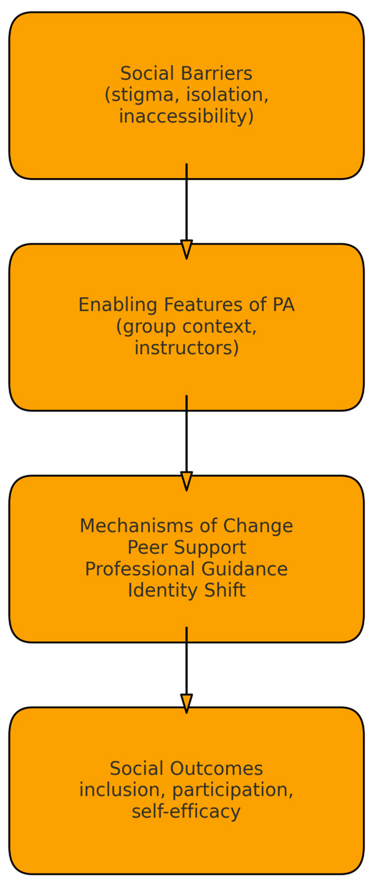 - Intervention: Any form of PA, exercise, adapted exercise, recreational activities, or lifestyle PA. Studies were eligible if they examined social barriers (e.g., stigma, lack of support), social facilitators (e.g., peer support, group settings), or social consequences (e.g., identity change, social participation) related to PA.