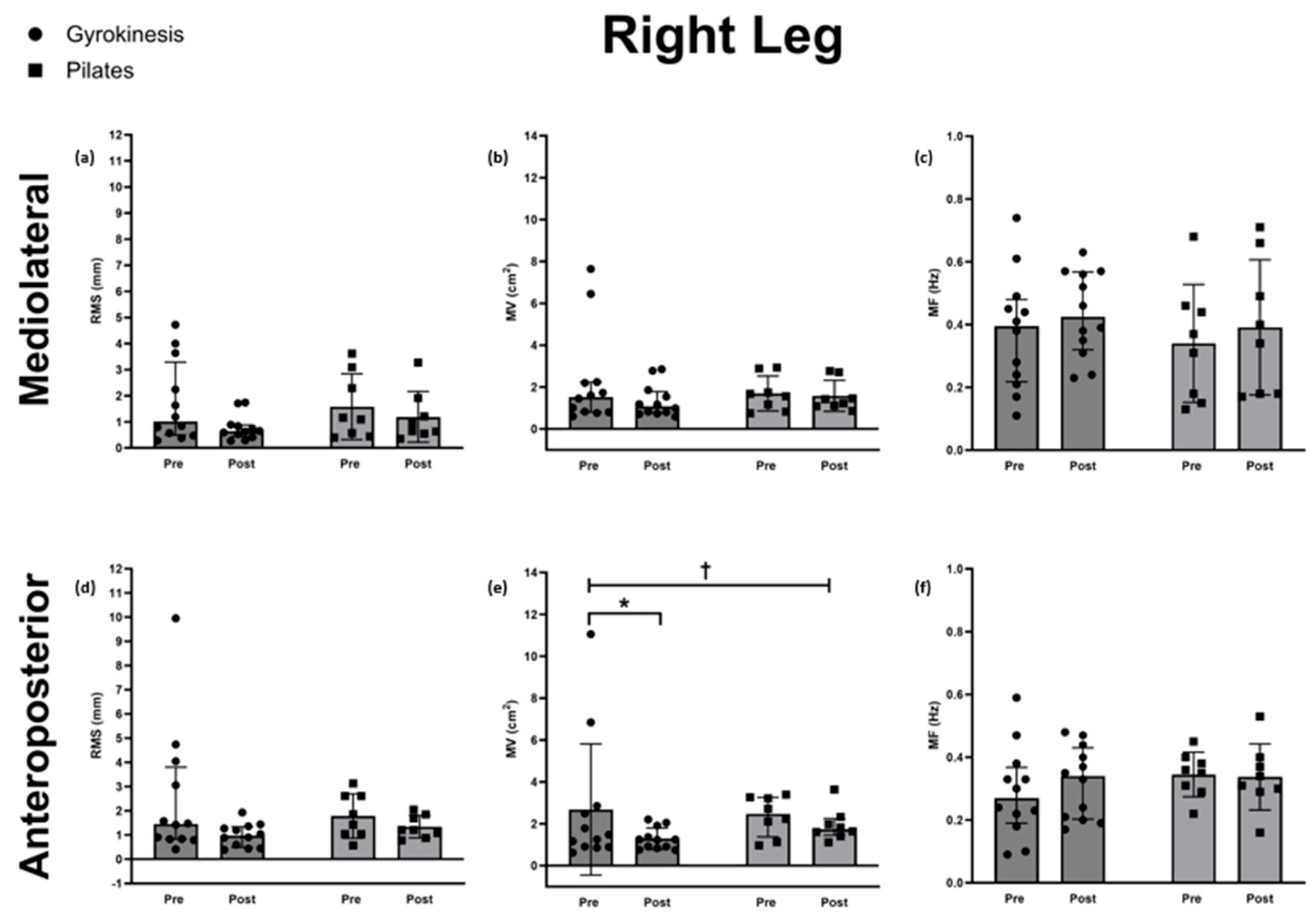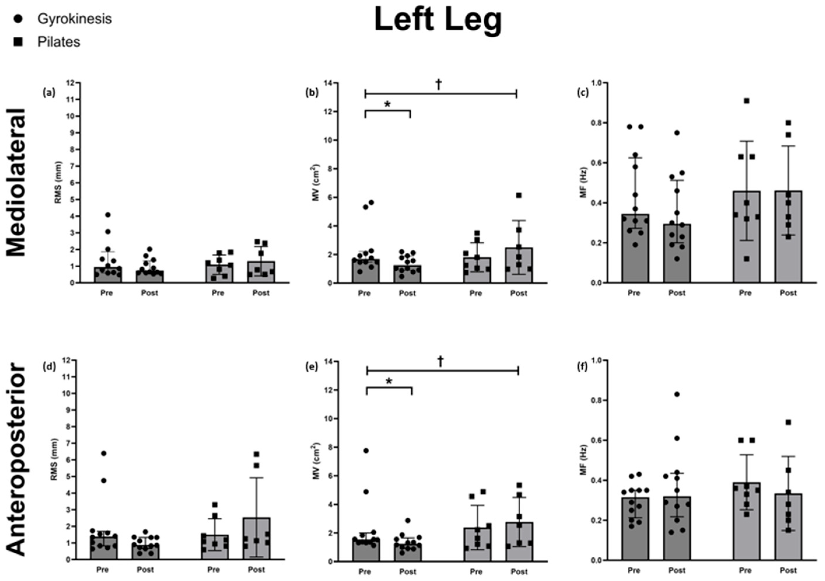 | Gyrokinesis (Mean, 95% CI; or Median, Q1–Q3) | Pilates (Mean, 95% CI; or Median, Q1–Q3) | Statistical Significance and Effects Sizes | ||||||