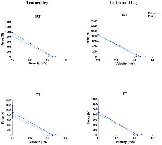Regarding the pre-test, the medians of R2 for the trained and untrained legs were 0.972 (Range: 0.865 to 0.993) and 0.972 (Range: 0.926 to 0.992), respectively. The SEE values were 25.98 ± 11.84 N for the trained and 28.14 ± 13.39 N for the untrained leg. Considering the post-test, R2 for the trained and untrained legs were 0.966 (Range: 0.927 to 0.986) and 0.960 (Range: 0.919 to 0.991). The SEE values in the post-test were 36.44 ± 12.48 N for the trained and 30.65 ± 15.58 N for the untrained legs. Table 2 and Table 3 show pre–post values (mean ± standard deviations) and ANOVA results. Overall, significant increases in the post-test were observed in both the trained and untrained legs regarding F0 and Pmax, whereas only SFV was improved after intervention in the trained leg (p = 0.001; pη2 = 0.495). Figure 2 represents the mean force–velocity relationships before and after intervention in both groups (i.e., TT and IRT) and both legs (i.e., trained and untrained).
