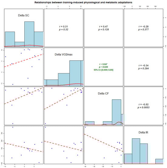Correlations between individual changes (delta) in physiological and molecular markers from pre-season to early-season (n = 12). Delta values represent early-season minus pre-season (early − pre) for salivary cortisol, VO2max, cell-free DNA (cfDNA), and irisin. The diagonal panels show histograms of the distribution of Δ for each variable. The lower panels display scatterplots (blue dots) with fitted regression lines (red dashed lines). The upper panels present Pearson correlation coefficients (r) and corresponding p-values. Where applicable, 95% confidence intervals (CI) are shown. Asterisks indicate statistically significant correlations (p < 0.05).