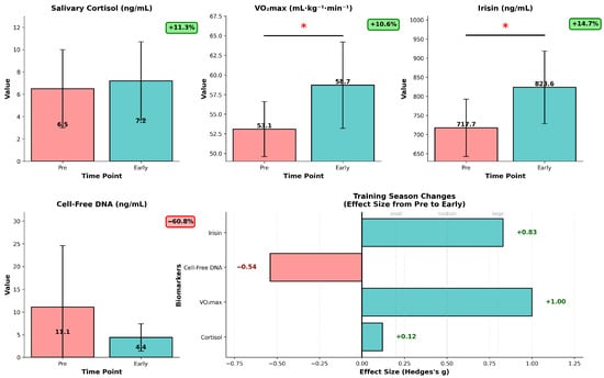 Longitudinal biomarker analysis for training season progression in U18 ice hockey players (n = 12). Data are presented as mean ± SD, red bars represent pre-season values, teal bars represent early-season values, individual values are overlaid. * p < 0.05 (paired t-test, pre- vs. early-season). Salivary cortisol (ng/mL) showing non-significant increase (+11.3%, p = 0.667), VO2max (mL·kg−1·min−1) demonstrating significant improvement (+10.6%, p = 0.003), irisin levels (ng/mL) with significant elevation (+14.7%, p = 0.010), cell-free DNA (ng/mL) showing reduced baseline, moderate effect (−60.8%, p = 0.070). The low right panel shows corresponding Hedges’ g effect sizes (Δ = early − pre), with horizontal reference lines for small (0.2), medium (0.5), and large (0.8) effects.