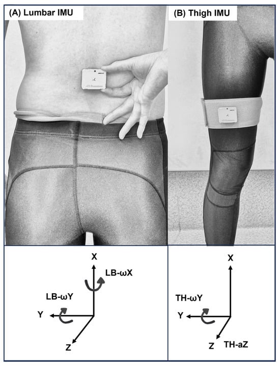 Two IMUs (AMWS020, ATR-Promotions, Kyoto, Japan; ±16 g, ±2000°/s; sampling rate: 500 Hz) were used, each integrating a triaxial accelerometer and a triaxial gyroscope. The sensors were attached to the anterior thigh (10 cm proximal to the patella) and to the spinous process of the third lumbar vertebra; these were defined as the thigh IMU and the lumbar IMU, respectively (Figure 2). The thigh IMU was oriented to measure angular velocity around the Y-axis (TH-ωY), representing thigh-raising velocity, and acceleration along the Z-axis (TH-aZ), used to detect thigh contact. The lumbar IMU was oriented to measure angular velocity around the X-axis (LB-ωX), representing lumbar region rotation, and around the Y-axis (LB-ωY), representing lumbar region flexion–extension (the coordinate axes and positive directions are illustrated in Figure 2). The IMUs data were transmitted wirelessly via Bluetooth to a personal computer (PC; MS-14D2, Micro-Star International, New Taipei City, Taiwan). The Y-axis angular velocity waveform from the thigh IMU was displayed simultaneously on the PC and an external monitor, which were connected via a cable. Both IMUs were synchronized prior to measurement.