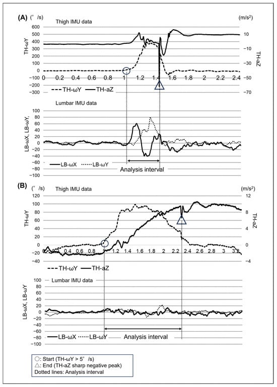 We measured the angular velocity of the lumbar region using a lumbar IMU. As this signal reflects the combined motion of the lumbar spine and pelvis, we interpreted it as a measure of lumbopelvic motion rather than isolated lumbar spine motion. Typical waveforms from the lumbar and thigh IMUs are shown in Figure 3. The analysis interval was defined based on thigh movement data obtained from the thigh IMU. The start time was when the TH-ωY of the thigh IMU exceeded 5°/s (indicating the start of the thigh-raising movement). The end time was when the Z-axis acceleration waveform of the thigh IMU (TH-aZ) showed a sharp negative peak (indicating contact of the thigh with the cushion). The subsequent 3 s single-leg stance phase after thigh contact was excluded from the analysis to avoid potential confounding effects of postural stabilization and trunk muscle activation unrelated to the thigh-raising movement. If TH-ωY displayed a value of −5°/s or lower before the initiation of the thigh-raising movement, we judged that the participant had generated a recoil motion involving a small backward displacement of the thigh (i.e., hip extension) and excluded the attempt as a failed trial. The −5°/s threshold for recoil detection was determined based on preliminary testing with synchronized gyroscope signals and high-speed video recordings, which allowed visual confirmation that negative angular velocity ≤ −5°/s corresponded to recoil motion.