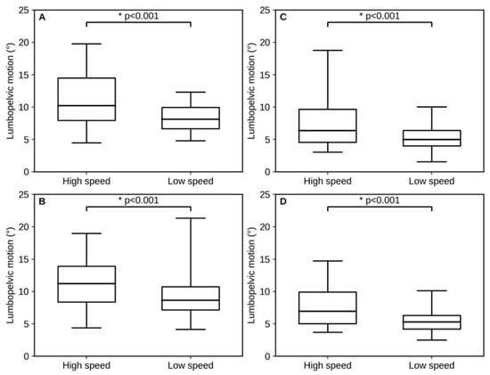Comparison of lumbopelvic motion during the thigh-raising task under high- and low-speed conditions. (A) Lumbopelvic rotation of the dominant leg, (B) Lumbopelvic rotation of the non-dominant leg, (C) Lumbopelvic flexion–extension of the dominant leg, and (D) Lumbopelvic flexion–extension of the non-dominant leg. The box indicates the interquartile range (25th–75th percentiles) and the center line indicates the median. Whiskers indicate the minimum and maximum values.