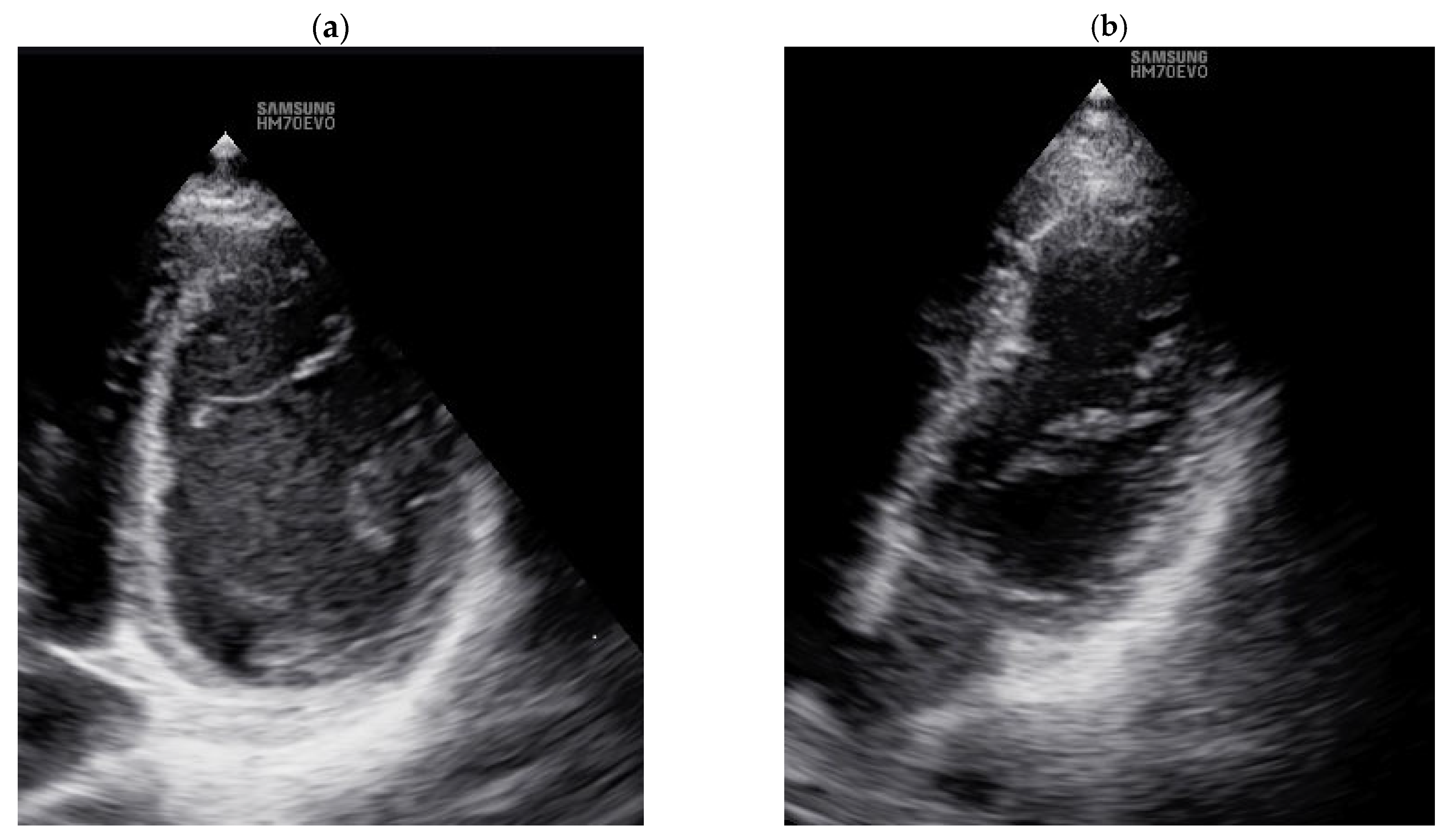 - Lang, R.M.; Badano, L.P.; Mor-Avi, V.; Afilalo, J.; Armstrong, A.; Ernande, L.; Flachskampf, F.A.; Foster, E.; Goldstein, S.A.; Kuznetsova, T.; et al. Recommendations for cardiac chamber quantification by echocardiography in adults: An update from the American Society of Echocardiography and the European Association of Cardiovascular Imaging. Eur. Heart J. Cardiovasc. Imaging 2015, 16, 233–271. [Google Scholar] [CrossRef] [PubMed]