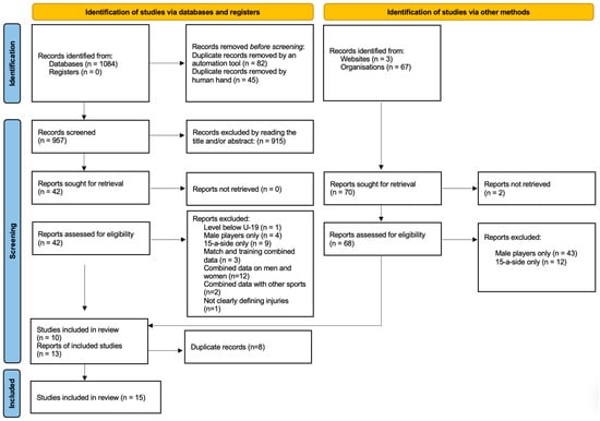 From 1084 database records and 70 additional sources, 957 records were screened. After exclusions for duplicates, irrelevance, and ineligible study characteristics (e.g., male-only samples, combined data, 15-a-side rugby), 15 studies met the inclusion criteria for the systematic review (Figure 1). There were no Portuguese studies in this search. No studies that initially appeared eligible were later excluded after full-text review.