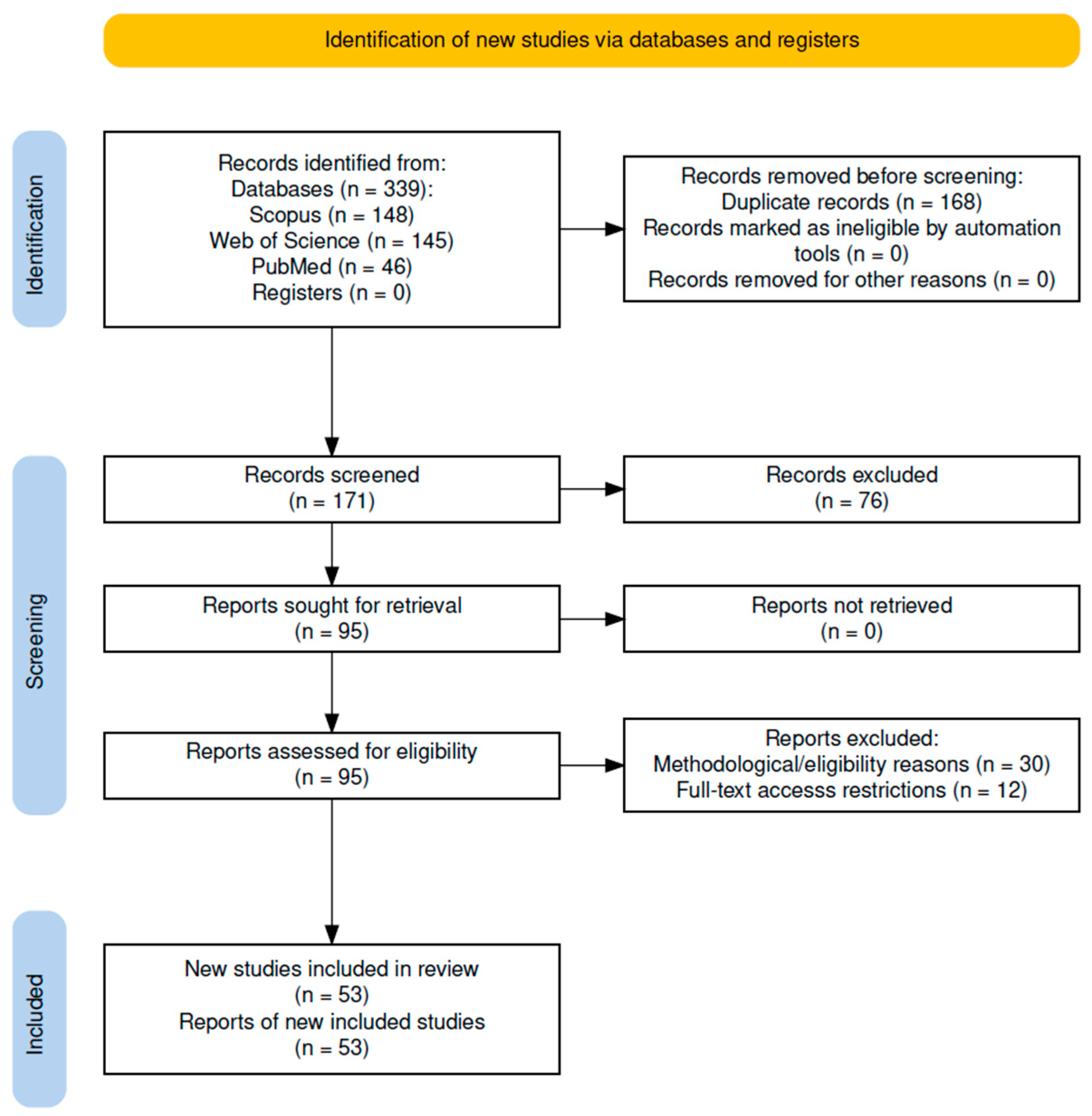 - Technological exposure and/or analytical approach. We included studies that applied or evaluated: (a) Artificial intelligence/machine learning (AI/ML) only. Artificial intelligence and/or machine learning (AI/ML) models applied to volleyball-related data for classification, prediction, or pattern detection in load, fatigue, readiness, performance, or injury, provided that they reported an explicit training and validation procedure (e.g., train/test split or cross-validation) and/or performance metrics. Conventional descriptive or inferential analyses without predictive validation were not classified as AI/ML in this review. (b) Non-invasive monitoring technologies only. Non-invasive devices, sensors, or measurement systems to quantify load, assess multidimensional fatigue, or monitor readiness (e.g., inertial measurement units, force platforms, heart rate and heart rate variability, wellness questionnaires, global/local positioning systems), regardless of whether the analysis was descriptive or based on traditional statistical methods. (c) AI/ML + monitoring combination. Integrated systems combining non-invasive technologies with AI/ML models (as per the operational definition above) for multi-source integration and/or predictive estimation of states (e.g., fatigue/readiness). (d) Comparative studies. Studies comparing technologies, metrics, or analytical approaches (including AI/ML versus traditional approaches) regarding their practical value for monitoring load/fatigue/readiness and/or their association with performance or injury outcomes.