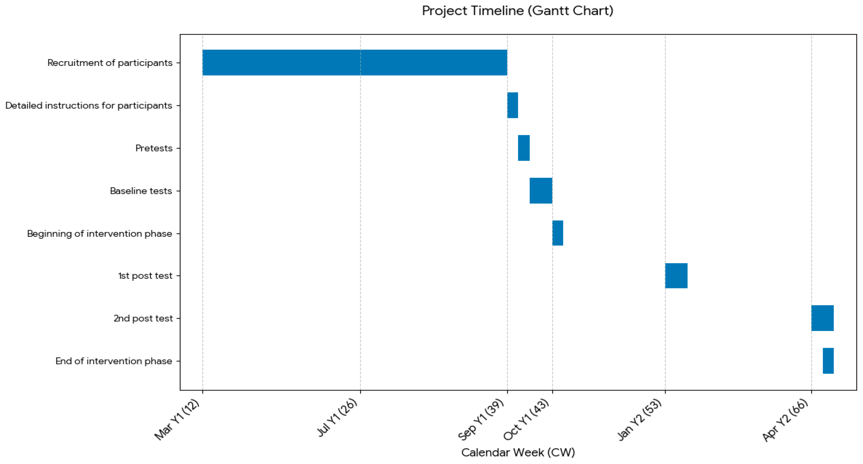 Baseline assessments were conducted in early October (weeks 41–42), immediately prior to the intervention launch in mid-October (week 43). The study design included two follow-up assessments. The main post-test, which was the second follow-up assessment, was conducted six months after the intervention began, in April (week 13 for the intervention group and weeks 13–14 for the control group). An interim post-test was also scheduled halfway through the intervention, three months after the trial began. However, the interim assessment at three months was intentionally restricted to body composition and biomedical indicators, such as BMI, weight distribution as well as leg circumference. This decision was primarily based on the hypothesized time course of fascial adaptation; while SMR is known to induce immediate thixotropic responses in the fascial ground substance [