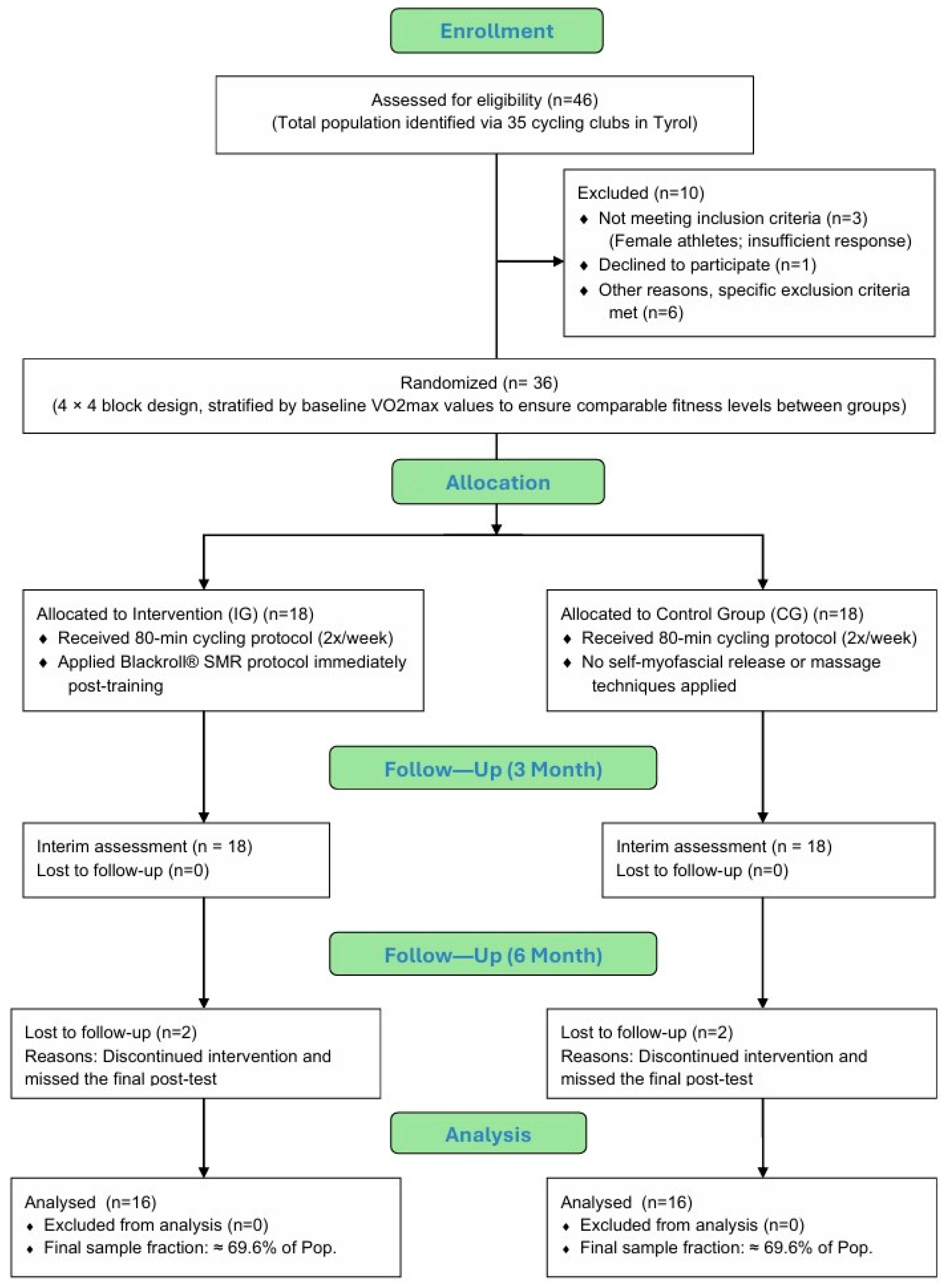 2max values were used to stratify participants. In doing so, athletes were ranked according to their maximum oxygen intake in descending order, grouped into sets of four and then distributed evenly across the two groups. This procedure helped maintain a comparable baseline fitness level between the two groups. The following diagram illustrates the flow of participants through the study, beginning with the initial assessment of 46 individuals from 35 cycling clubs in Tyrol, Austria. It details the transition from enrollment to the randomization of 36 participants. The chart further tracks the 6-month follow-up period and documents the retention rates and the final sample fraction, which represents approximately 69.6% of the population, leading to the final analysis of the sample (