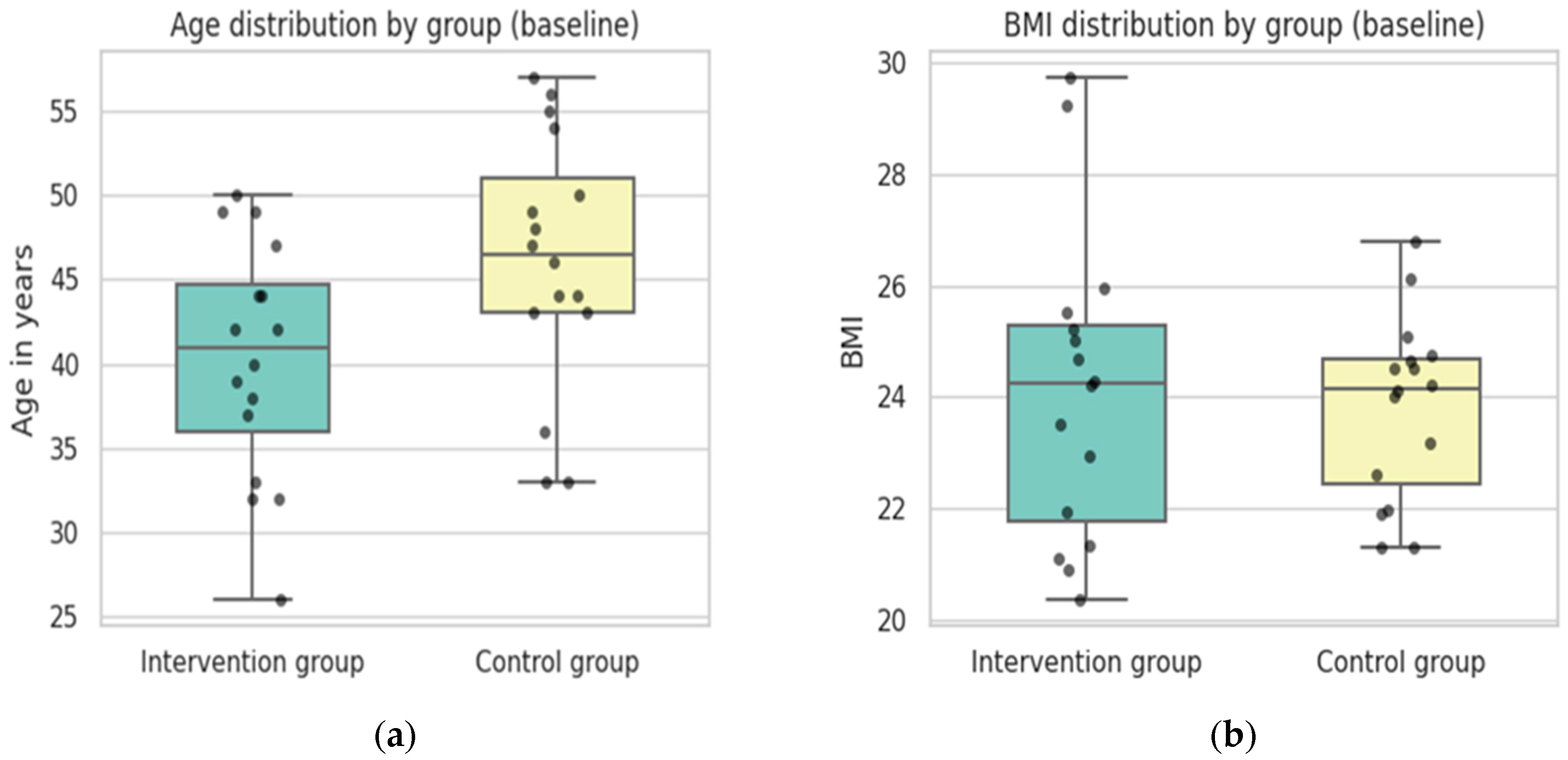 This left a final sample of 32 participants, 16 participants each group, representing a substantial ≈ 69.6% of the total population. The baseline characteristics of the final sample are summarized in