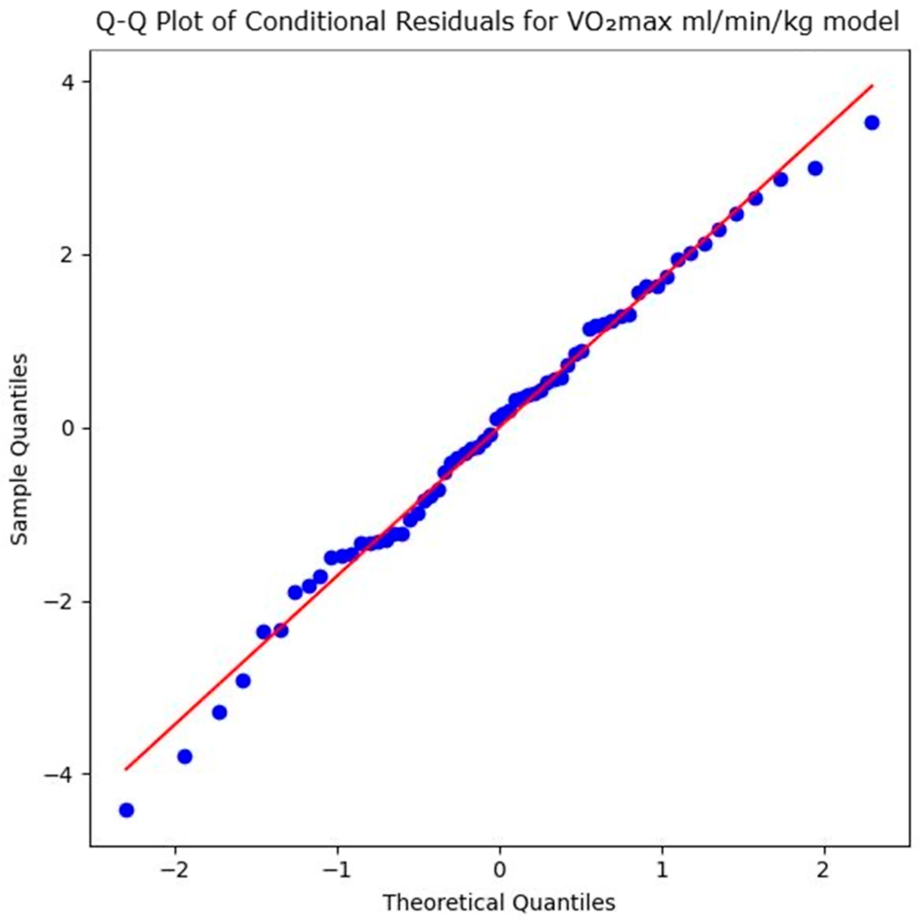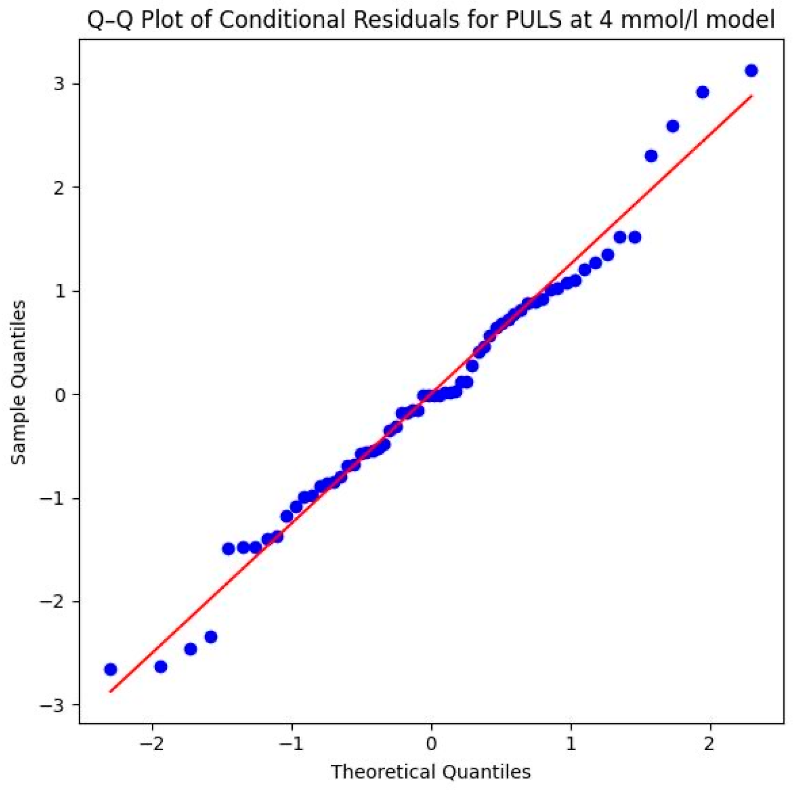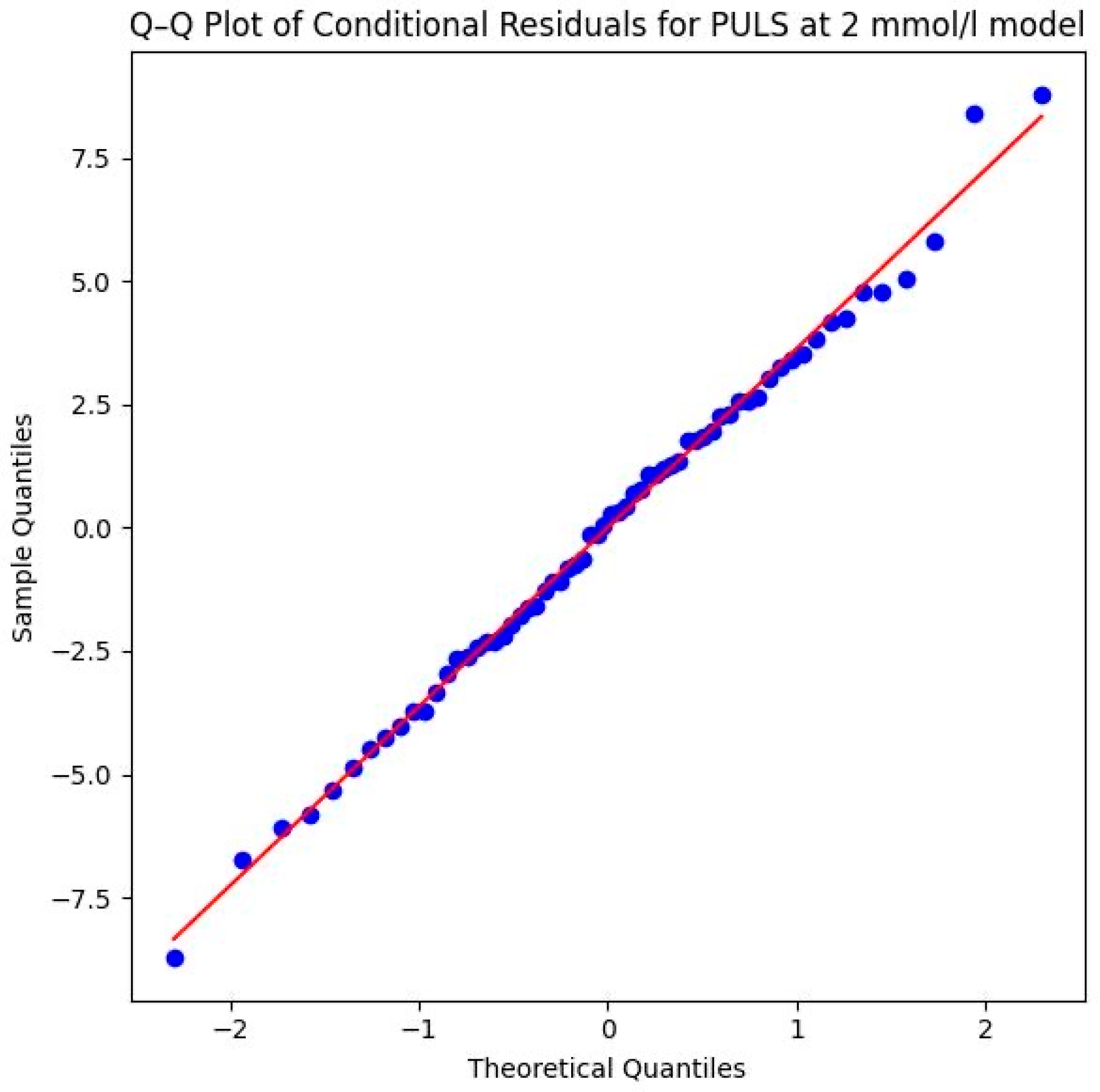 To ensure the validity of the analysis, model robustness was evaluated by testing the normality of the conditional residuals using a Shapiro–Wilk test and by visually inspecting Q–Q plots of the conditional residuals [