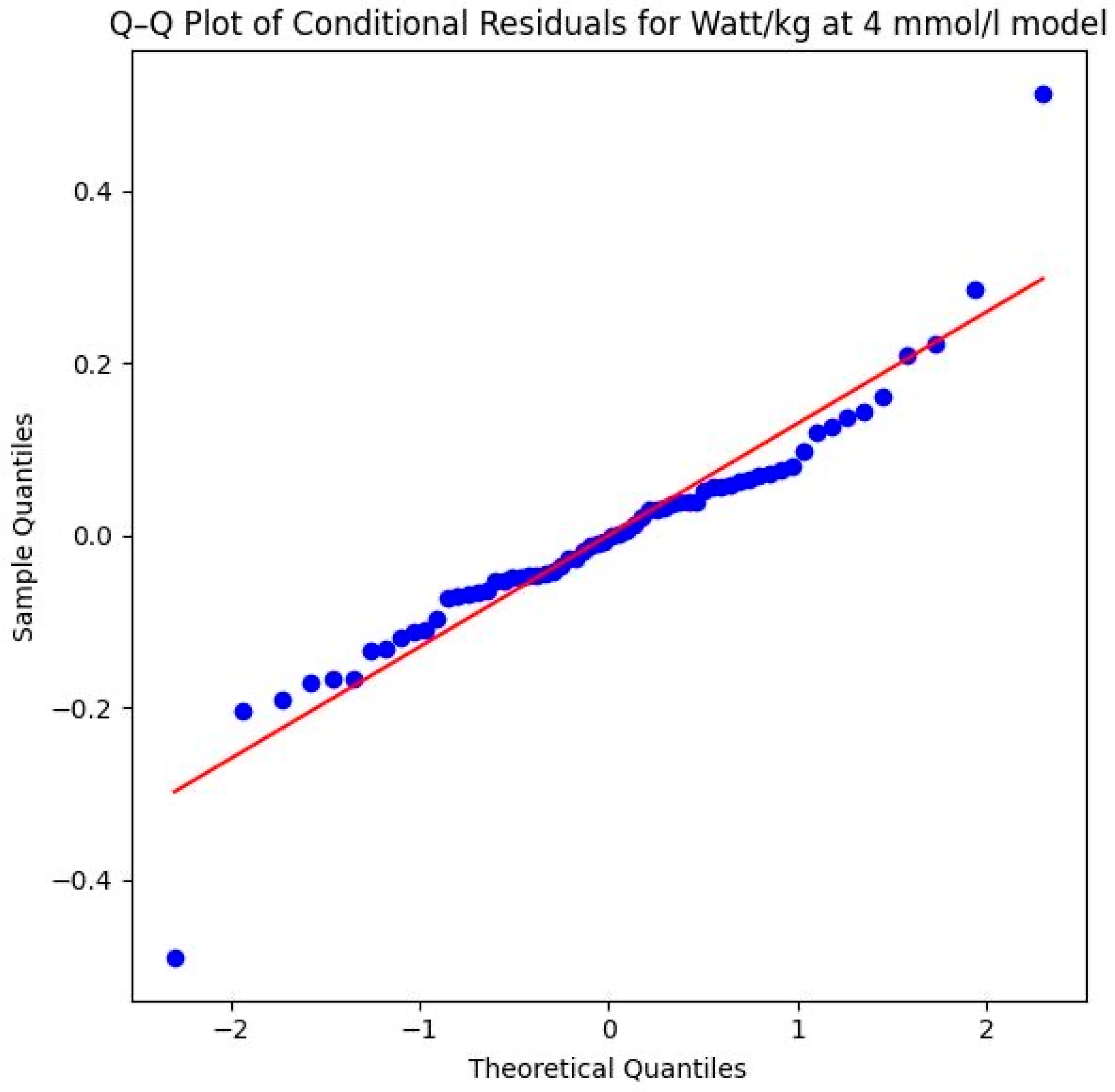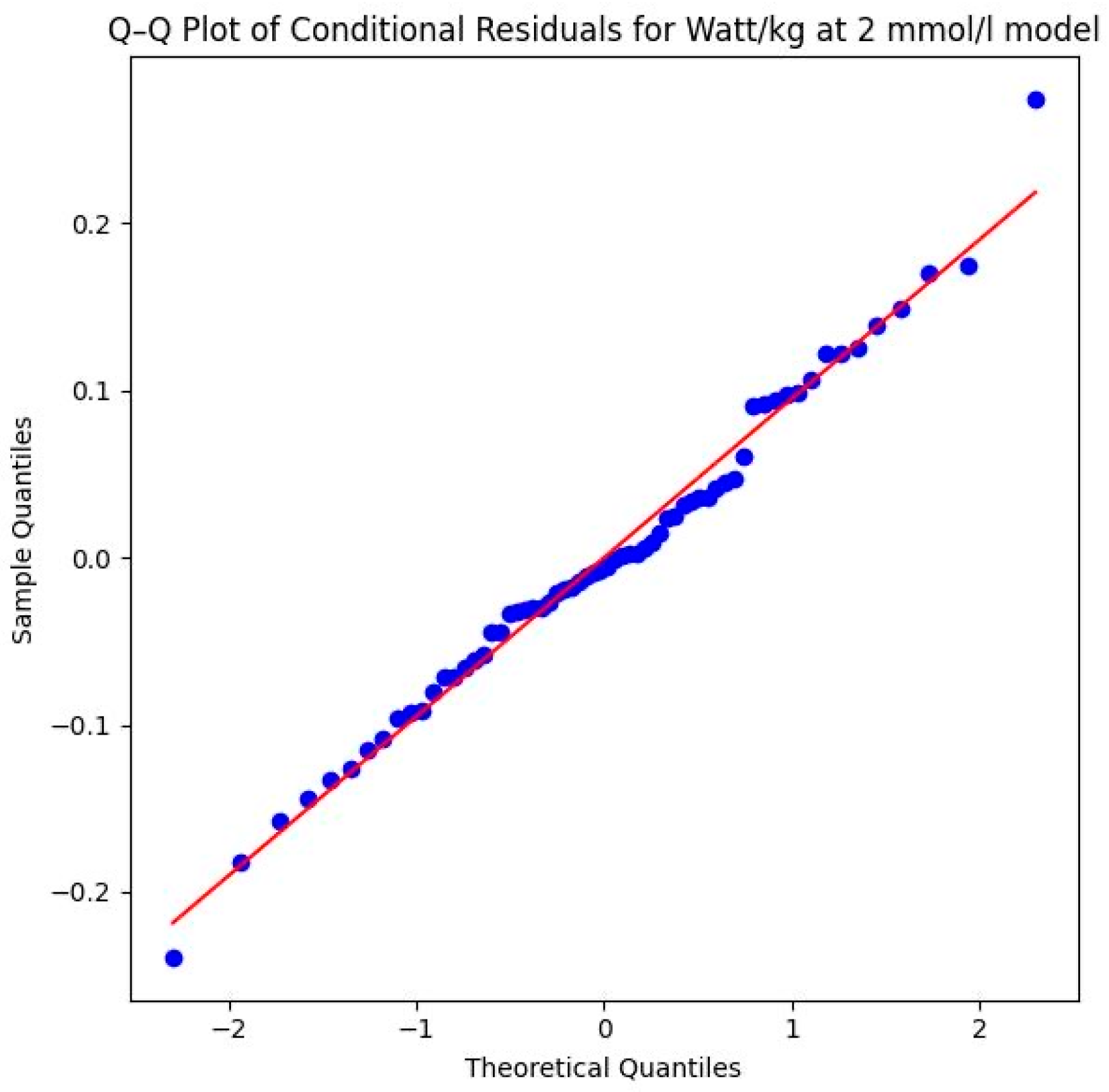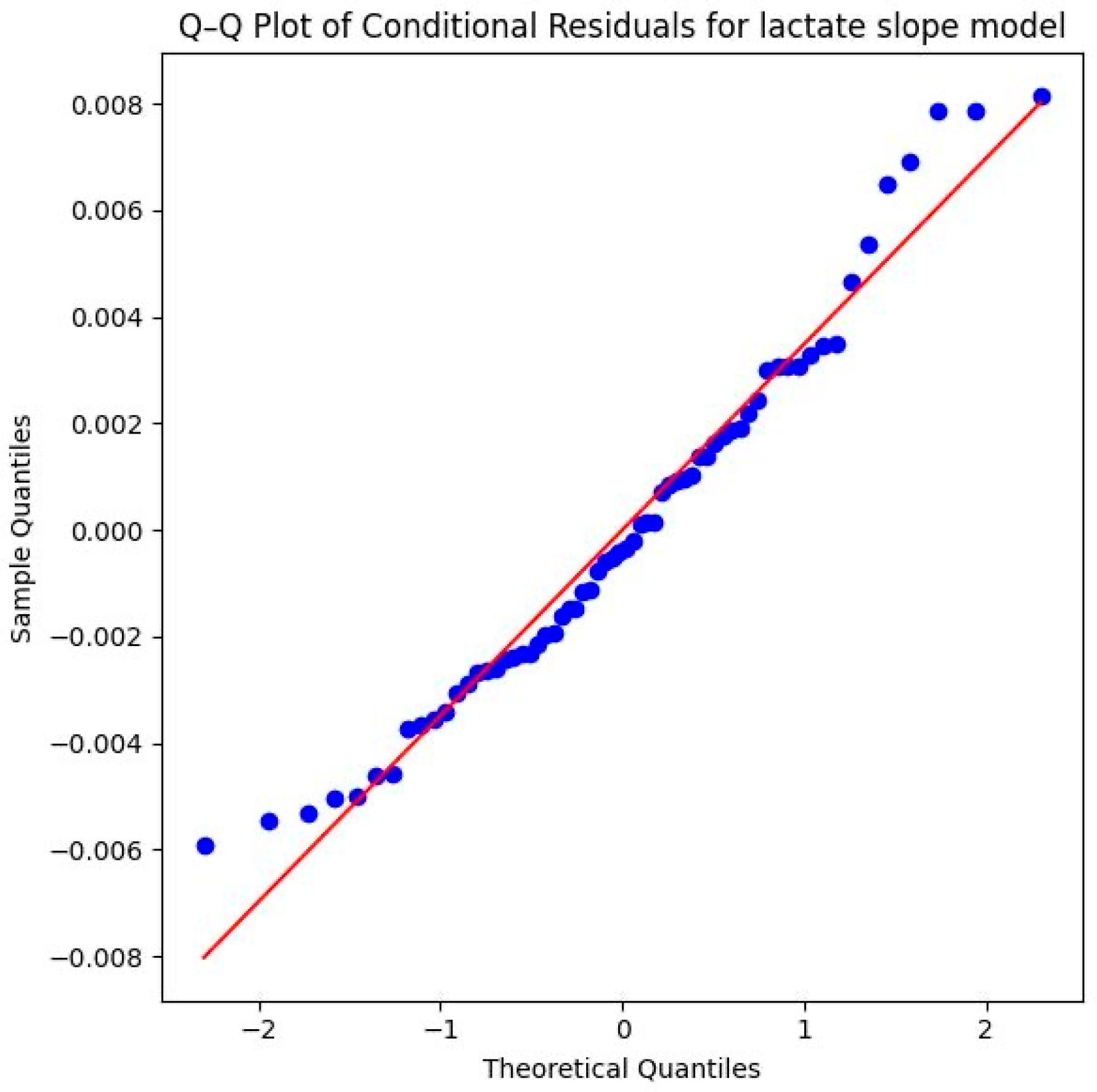To ensure the validity of the analysis, model robustness was evaluated by testing the normality of the conditional residuals using a Shapiro–Wilk test and by visually inspecting Q–Q plots of the conditional residuals [
