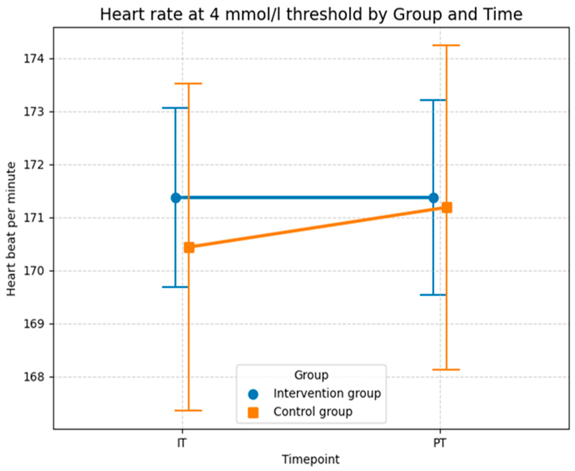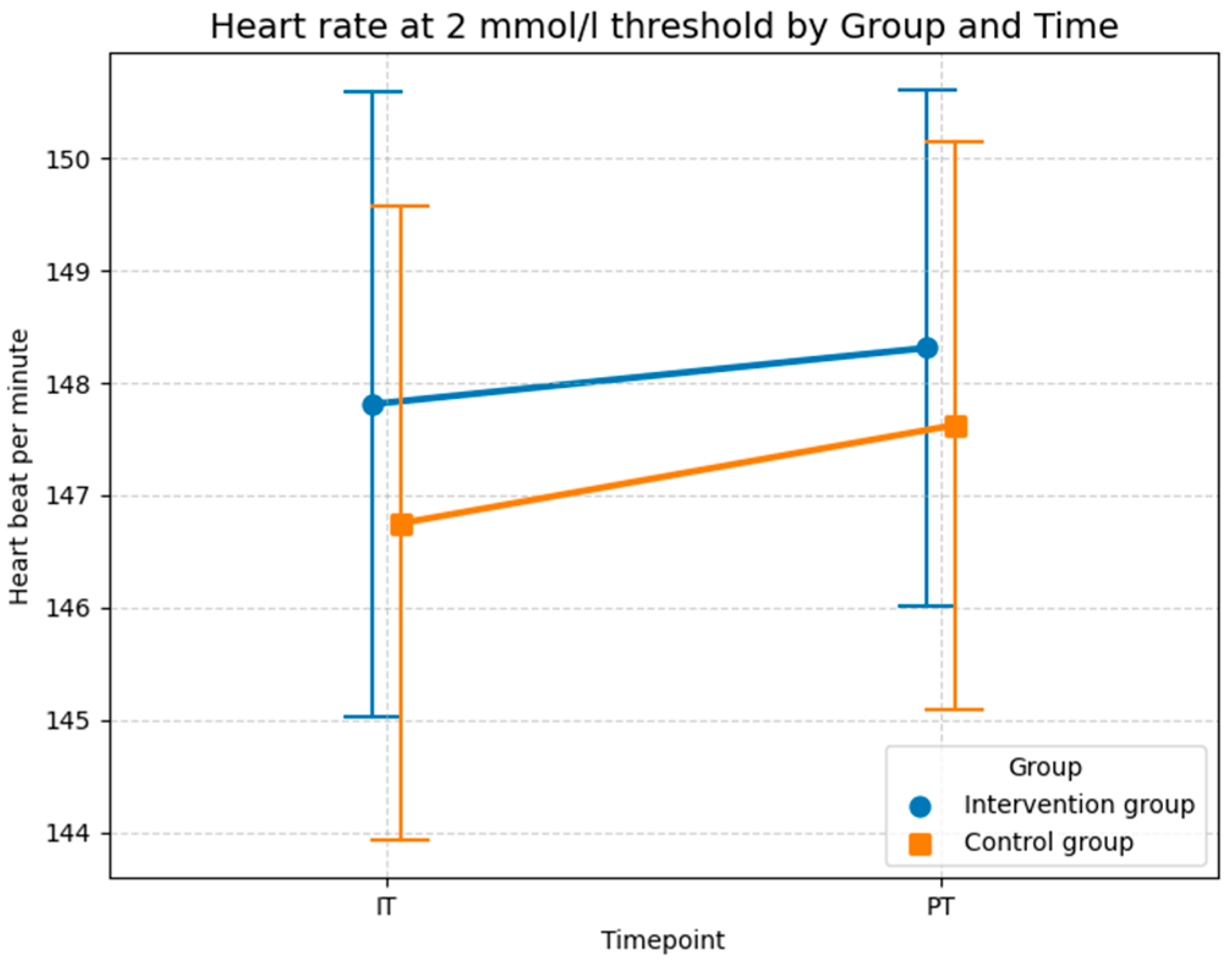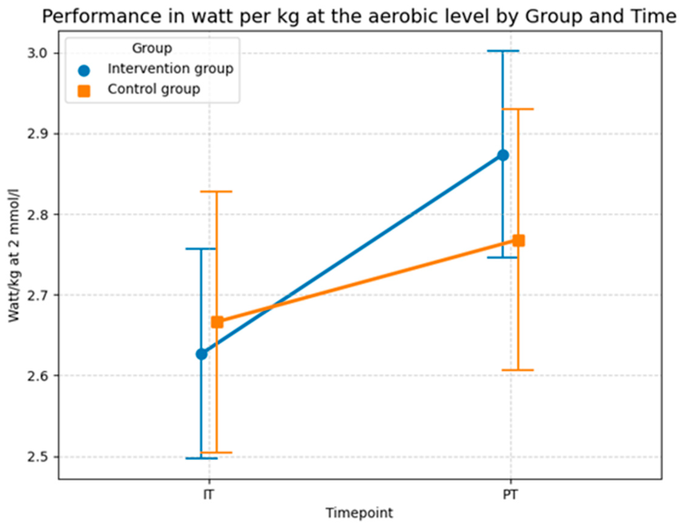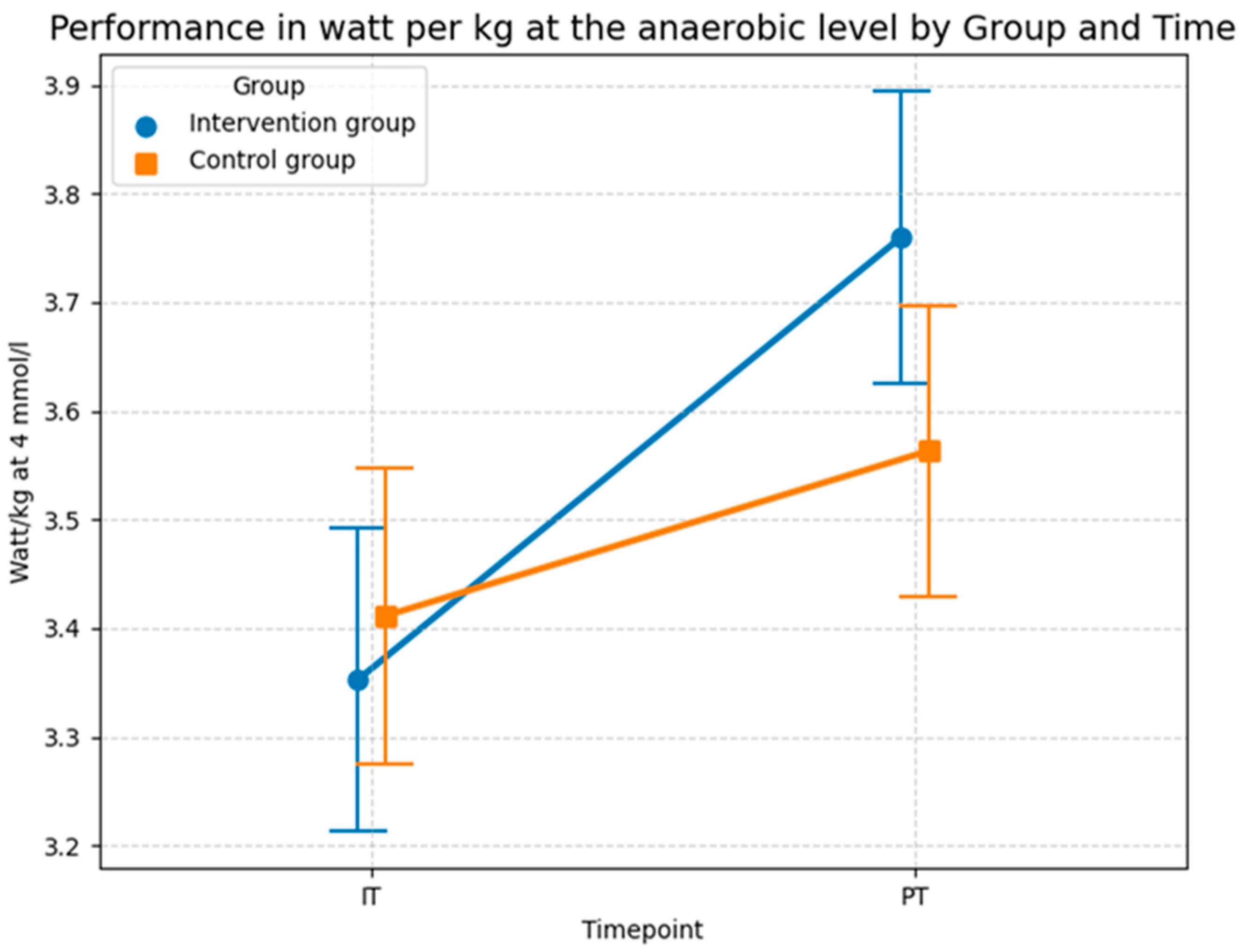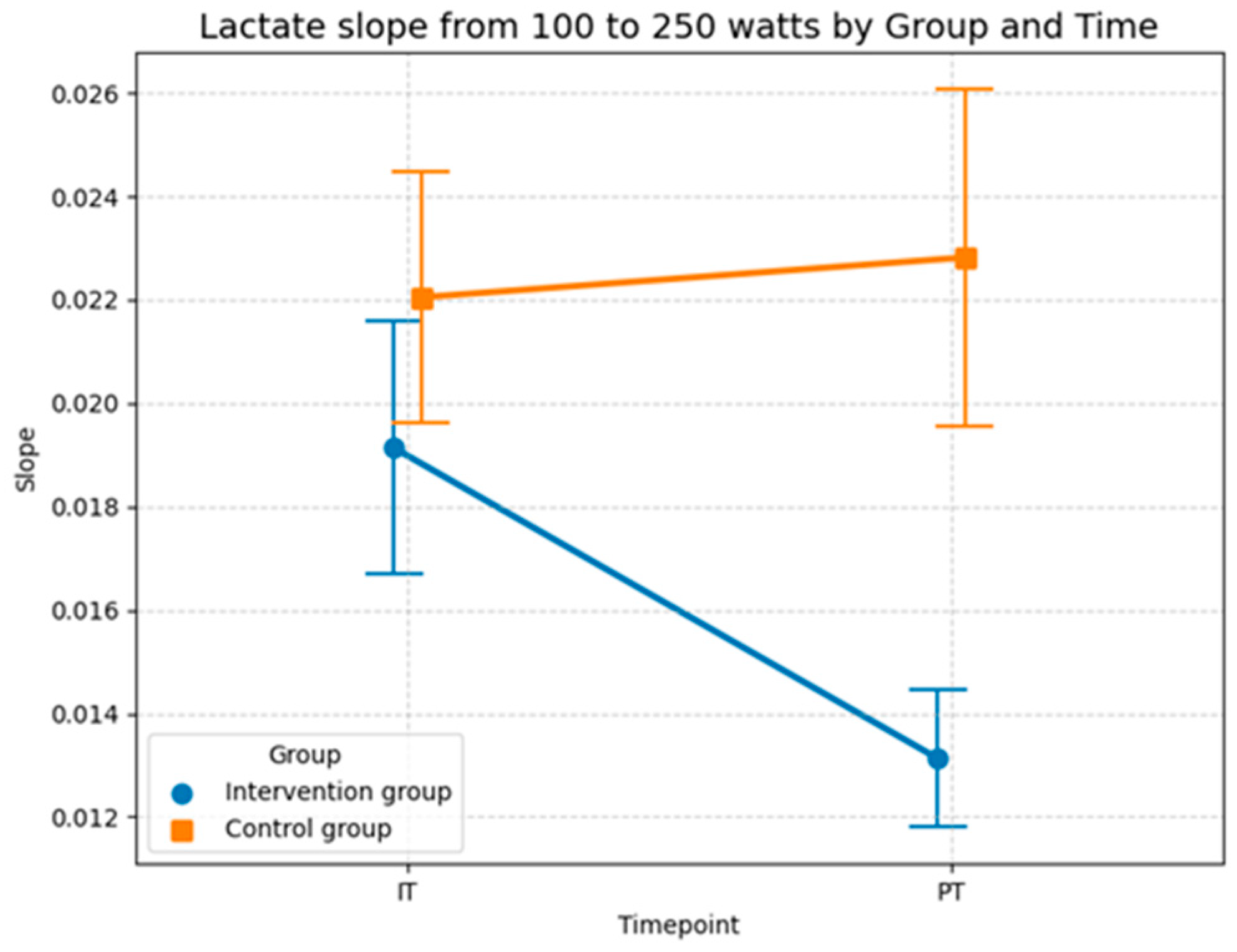 This adjustment was particularly critical for isolating the intervention effect across our primary pillars: the systemic oxygen intake (VO2max relative to body mass), heart rate response at fixed lactate thresholds (2 and 4 mmol/L), and the progression of the lactate curve. Specifically, the slope analysis between 100 and 250 watts and the assessment of relative power output (W/kg) were adjusted to ensure that the observed improvements in mechanical endurance and metabolic economy were independent of the participants’ age, thereby increasing the precision of the estimated treatment effects.