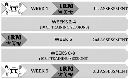 Study development and preliminary assessment points. TT (Tibana Test). 1RM: Estimation of the one repetition maximum for the back squat, clean and jerk, and clean/TT: Tibana Test, which measures performance in terms of number of repetitions, ventilatory response, heart rate, blood lactate, CMJ, and perceived effort.