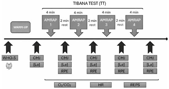Timeline of assessments of study participants during testing days. CMJ (countermovement jump); [La] (blood lactate); O2/CO2 (respiratory exchange); Reps (repetitions); RPE (Rate of Perceived Effort). The following acronyms were used in this figure. WHO-5: well-being questionnaire/CMJ: maximum height in countermovement jump/[La]: blood lactate/RPE: Rate of Perceived Effort 0-10/O2/CO2: ventilatory exchange/HR: heart rate as the mean and maximum/REPS: Performance measure of the number of repetitions during the test.