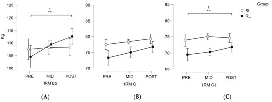 Graphical representation of the three 1RM assessments of the back squat, the clean and jerk, and the clean conducted pre-, mid- and post-intervention. BS (back squat); C (clean); CJ (clean and jerk); SL (standardized load); RL (relativized load). Note. (A) 1RM for the back squat; (B) 1RM for the clean and jerk; (C) 1RM for the clean. SL = standardized group, represented by open circles; 1RM = One repetition maximum; RL = relativized group, represented by solid black circles; PRE = first week of the intervention; MID = fifth week of the intervention; POST = ninth week of the intervention (the final week). ** p < 0.01; † differences between PRE and POST in RL group.
