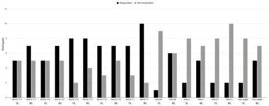 Finally, we found that 70% of the participants in the SL group were classified as responders. In addition, over 83% of RL group members had a positive result, and were also classified as responders to the training intervention. However, this difference was not statistically significant. Moreover, with respect to 1RM improvements, fewer than 20% of SL participants showed clear individual progress in the BS and C categories, while approximately 50% of RL participants improved in both exercises. A similar trend was observed for CMJ height, where approximately 20% of SL participants were classified as responders, compared to over 45% from the RL group (Figure 5).