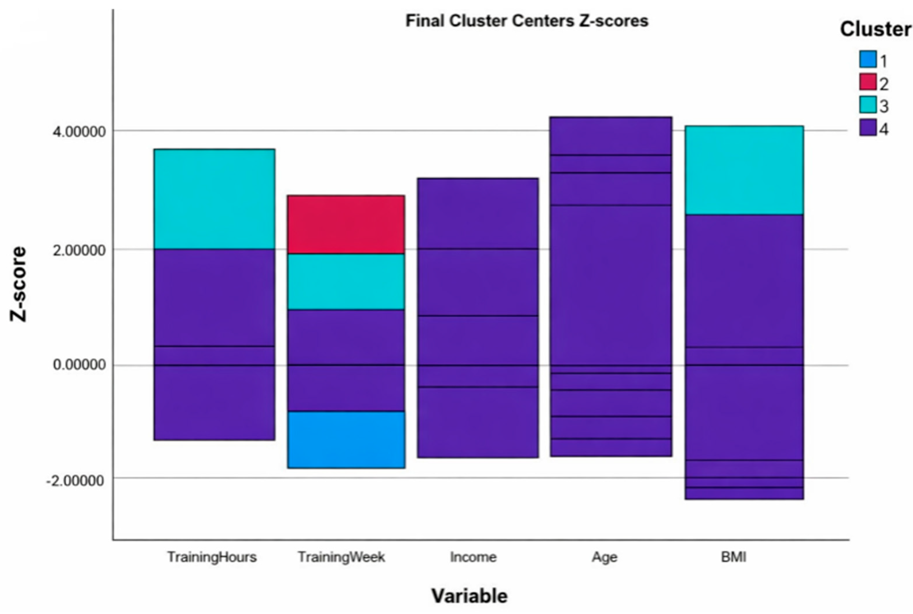 Figure 1 presents the standardized cluster centers for training duration, training frequency, income, age, and BMI. Cluster 2 displayed elevated scores across training-related and somatometric dimensions, Cluster 1 showed moderate values, and Clusters 3 and 4 exhibited lower scores across most variables, confirming the segmentation identified in the analysis.