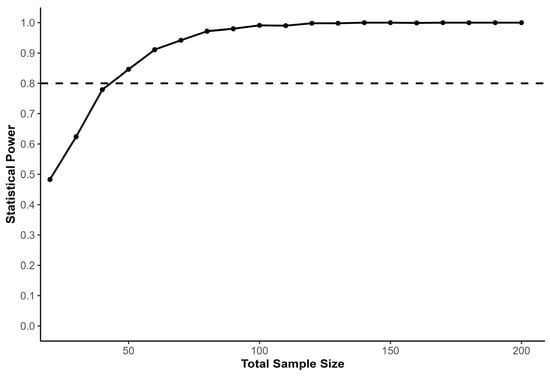 We conducted a Monte Carlo power analysis using simulated datasets to estimate the sample size required to detect a training effect within a linear mixed-effects modeling framework. Monte Carlo simulation was selected because it allows statistical power to be estimated under complex analytical structures that mirror the final statistical model used in the study. The primary outcome variable was 5 m sprint time, selected due to its sensitivity to acceleration-oriented performance adaptations, whereas longer sprint distances increasingly reflect maximal-speed mechanical characteristics [22,23]. Short sprint distances are used in research examining acceleration performance in team-sport athletes and are included as outcome variables in studies of resisted sprint training [15,22]. Baseline sprint performance was simulated to reflect observed variability in youth soccer players (M = 1.17 s, SD = 0.03), and pre-to-post performance changes were generated assuming a trivial mean effect in the TS (d = 0.10, SD = 0.09) and a moderate effect in the WVG (d = 0.55, SD = 0.15), consistent with reported adaptations following resisted sprint training interventions targeting acceleration performance [15]. The expected experimental-group effect size was set slightly below the value reported in the cited study (d = 0.65) in order to provide a conservative estimate of the anticipated training effect. Standardized effect sizes were converted to absolute sprint time changes using the baseline standard deviation, ensuring simulated performance changes reflected realistic sprint performance values. The simulated LME model included fixed effects for time, group, and their interaction, with participant identity entered as a random intercept to account for repeated measures. Within each simulation iteration, synthetic datasets were generated under the specified parameter assumptions, and the linear mixed-effects model was fitted via maximum likelihood to evaluate the statistical significance of the time × group interaction term. Power was estimated across total sample sizes ranging from 20 to 200 participants using 1000 simulation iterations per condition. Statistical power was defined as the proportion of simulations in which the interaction effect reached the predefined significance threshold (α = 0.05). The resulting power curve (Figure 1) illustrates the relationship between sample size and statistical power, with the conventional 80% threshold indicating the minimum required sample size. The analysis indicated that approximately 25 participants per group were required to achieve adequate power to detect the expected training effect.