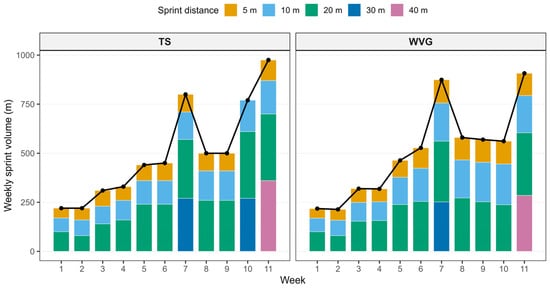 Comparison of weekly sprint training volume between the weighted vest group (WVG) and the traditional sprint group (TS) across the 11-week intervention period. Bars represent the mean weekly sprint distance for each group at each sprint distance (5 m, 10 m, 20 m, 30 m, and 40 m), with colors indicating the sprint distance. The black line with black points represents the mean total weekly sprint training distance for each group. Panels display the two groups separately to illustrate the progression and distribution of sprint training volume throughout the intervention period.