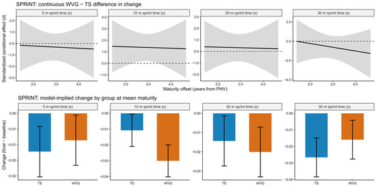 Model-based sprint performance outcomes across 5, 10, 20, and 30 m for the weighted vest (WVG) and traditional sprint (TS) groups in post-PHV athletes. The upper panels show the continuous standardized conditional effect representing the difference in change between WVG and TS across the observed maturity range, expressed as standardized effect sizes (d) with shaded bands indicating 95% confidence intervals. The dashed horizontal lines indicate the zero-effect reference line. The lower panels display model-implied changes (final minus baseline) in raw units for each group evaluated at the mean maturity level, with bars representing estimated changes and error bars indicating 95% confidence intervals. Positive values in the upper panels indicate a favorable effect of weighted vest training compared with traditional sprint training.