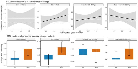 Model diagnostics likewise confirmed an appropriate fit for all CMJ outcomes, with residuals indicating normality and homoscedasticity, and no multicollinearity concerns. For jump height, differences in change between WVG and TS were moderate to large in magnitude but did not reach statistical significance across maturity offsets (Δ = 0.017 m; d = 0.97 to 0.98; p = 0.137), and no significant time × group interaction was observed (p = 0.108). Eccentric rate of force development (RFD) exhibited trivial to small effects in favor of WVG (d = −0.05 to 0.45), with wide confidence intervals and no statistically significant group differences (p = 0.936) or meaningful interaction effects (Figure 4). Peak power output showed moderate to large standardized differences favoring WVG (d = 0.70 to 1.24), with model-implied changes ranging from approximately 1.9 to 3.4 W/kg; however, these differences did not reach statistical significance (p = 0.058), and the time × group interaction remained non-significant (p = 0.104). In contrast, RSI-modified demonstrated a differential training response. The WVG improved substantially more than TS, with a large standardized between-group difference in change (d = 1.55, 95% CI: 0.36 to 2.75; p = 0.012). However, after applying the Benjamini–Hochberg correction for multiple outcomes, the adjusted p-value exceeded the conventional significance threshold (BH-adjusted p = 0.096). Additionally, a significant time × training volume interaction was observed for RSI-modified (β = −0.0002, p = 0.007), suggesting that training volume partially moderated the magnitude of RSI adaptation. No meaningful interactions involving maturity offset were observed across CMJ outcomes overall; however, the continuous conditional effect estimates suggested that the between-group advantage for RSI-modified tended to become more pronounced toward the higher end of the observed maturity range, although this pattern should be interpreted cautiously given the non-significant time × group × maturity interaction and the widening uncertainty around the conditional estimates (see Figure 4).