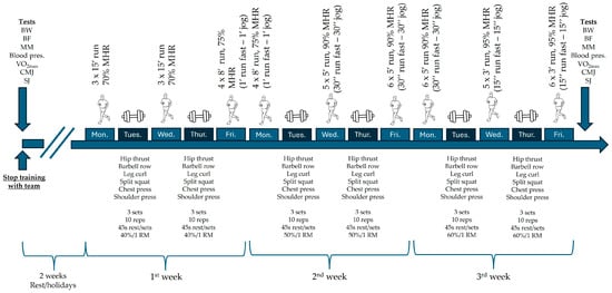 Strength training included six exercises (hip thrust, rowing, bench press, leg curl, split squat, shoulder press). Training intensity was set at 40% of 1 RM in week 1, 50% in week 2, and 60% in week 3. The program consisted of 3 sets of 10 repetitions each, with 45 s rest between sets. A total of six strength training sessions were conducted, each lasting approximately 60 min. Before strength training, a 15 min warm-up was performed, including cycling, stretching, and light repetitions of the programmed exercises at 20% of 1 RM.