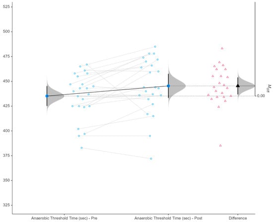 Paired raincloud plot of anaerobic threshold time (sec) pre- and post-intervention (p = 0.022). Note: Pre = pre-intervention; Post = post-intervention; Δ = difference (Post–Pre); Mdiff = mean difference; CI = confidence interval. Blue dots represent individual values connected by grey lines across conditions. Red triangles indicate individual Δ scores. Half-violin plots illustrate the distribution of values, while black markers denote group means with 95% confidence intervals (95% CI).