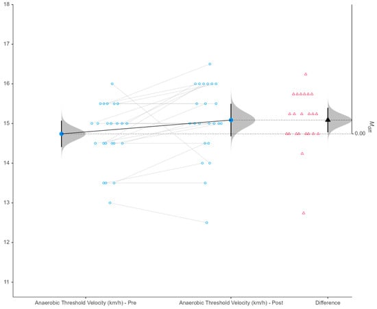 Paired raincloud plot of anaerobic threshold velocity (km/h) pre- and post-intervention (p = 0.029). Note: Pre = pre-intervention; Post = post-intervention; Δ = difference (Post–Pre); Mdiff = mean difference; CI = confidence interval. Blue dots represent individual values connected by grey lines across conditions. Red triangles indicate individual Δ scores. Half-violin plots illustrate the distribution of values, while black markers denote group means with 95% confidence intervals (95% CI).