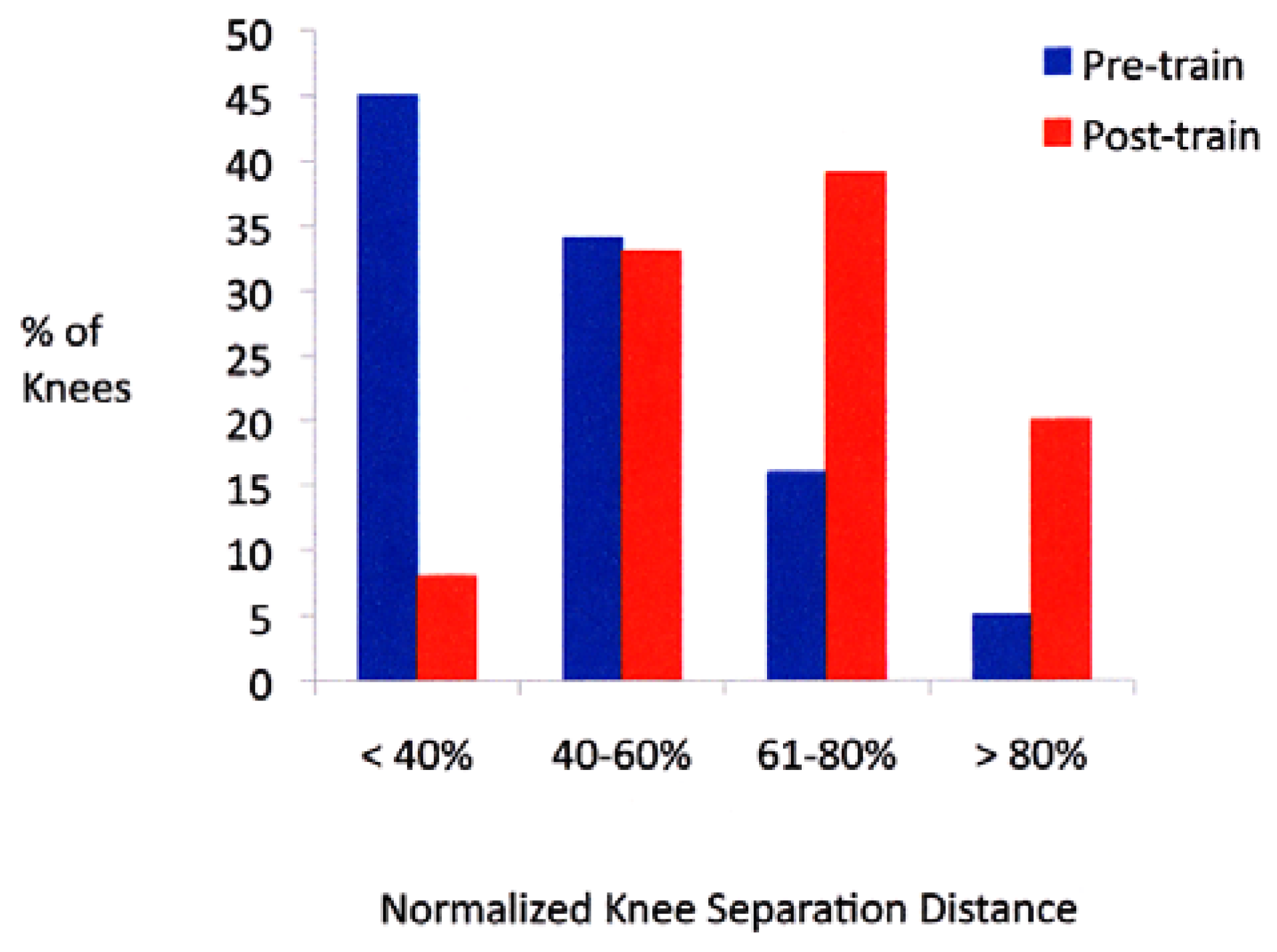Exclusionary criteria for training for this investigation were pre-existing multiple ankle sprains, evidence of a lower extremity joint effusion, or a history of a noteworthy knee injury such as a ligament rupture, meniscus tear, or patellar dislocation.