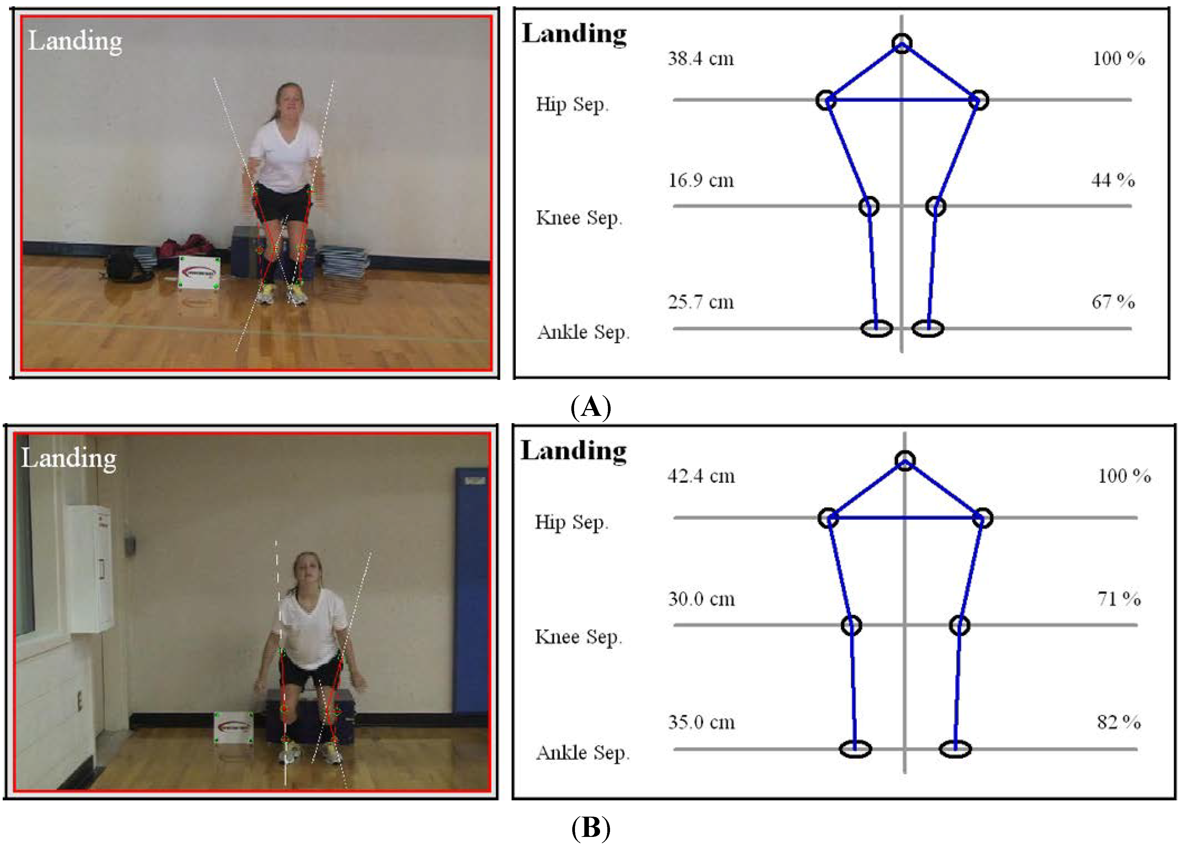 A video drop-jump test was used to measure overall lower limb alignment in the coronal plane [33]. A camcorder equipped with a memory stick was placed on a stand 102.24 cm in height and positioned approximately 365.76 cm in front of a box (dimensions: 30.48 cm in height, 38.1 cm in width). Velcro circles (2.54 cm) were placed on each of the four corners of the box that faced the camera. The athletes were dressed in fitted, dark shorts and low cut gym shoes. Reflective markers were placed at the greater trochanter and lateral malleolus of both legs and velcro circles were positioned on the center of each patella. The jump-land sequence was demonstrated and the athletes completed two practice trials allowed to ensure they understood the test. No verbal instructions regarding how to land or jump were provided. The athletes were simply instructed to land straight in front of the box to be in the correct angle for the camera to record properly. The athletes performed the jump-land sequence by first jumping off the box, landing, and immediately performing a maximum vertical jump. This sequence was repeated three times.