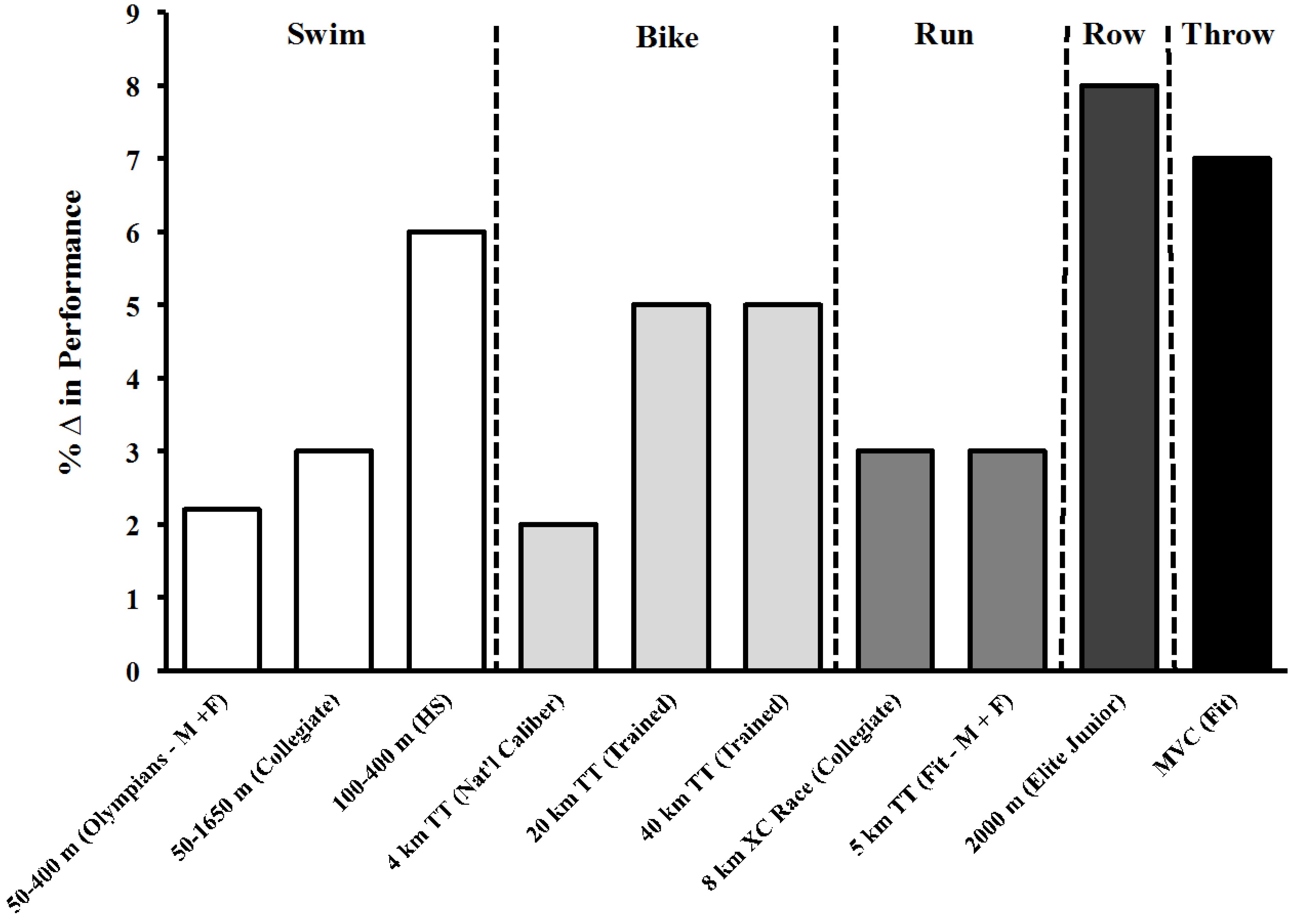 Reported performance benefits from taper in different athletic events and populations. Data were derived from the following studies in order from left to right: Swim-Mujika et al. 2002 [30], Costill et al. 1985 [4], D’Acquisto et al. 1992 [9]. Bike-Berger et al. 1999 [7], Neary et al. 2003 [24], Neary et al. 2003 [26]. Run-Luden et al. 2010 [5], Houmard et al. 1994 [23]. Row-Steinacker et al. 2000 [21]. Throw-Zaras et al. 2014 [18]. m = Meter; M = Male; F = Female; HS = High School; TT = Time Trial; T + F = Track and Field.