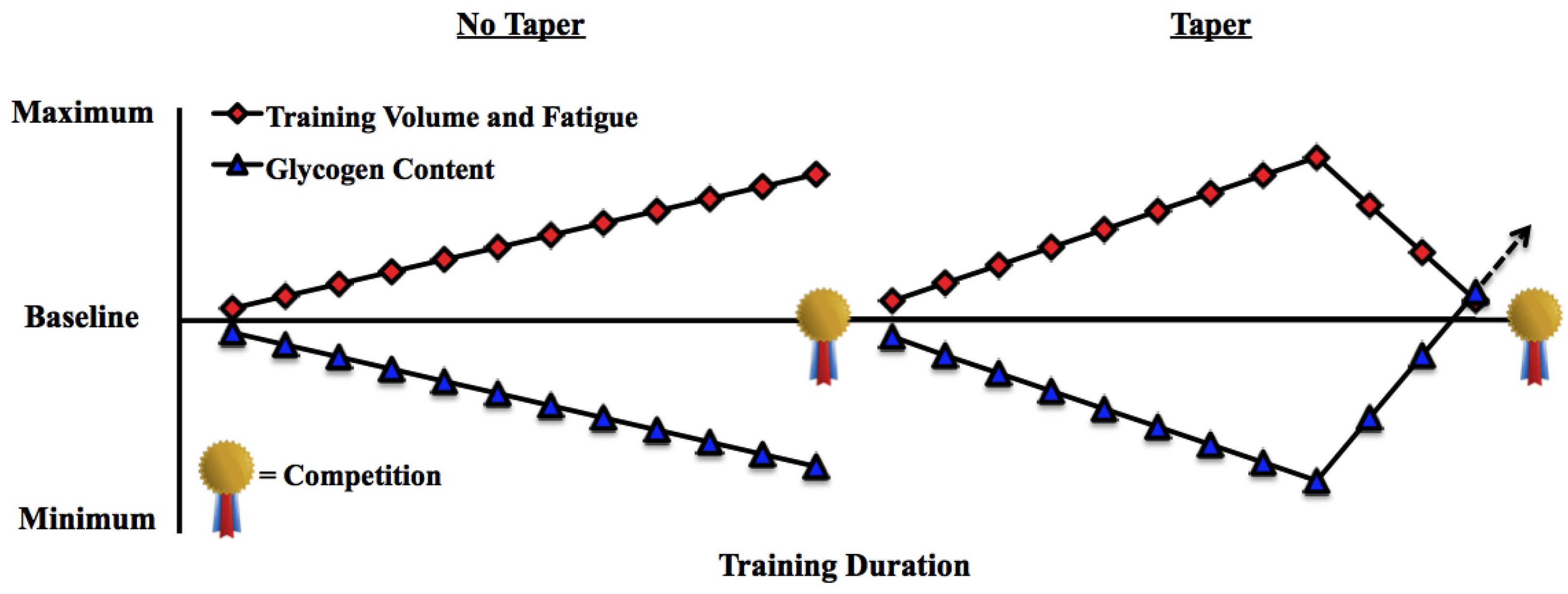 Illustration of training volume, accumulated fatigue, and skeletal muscle glycogen content in response to training with and without taper (assuming proper diet). Concept derived from Sherman et al. [37] and Halson et al. [40].