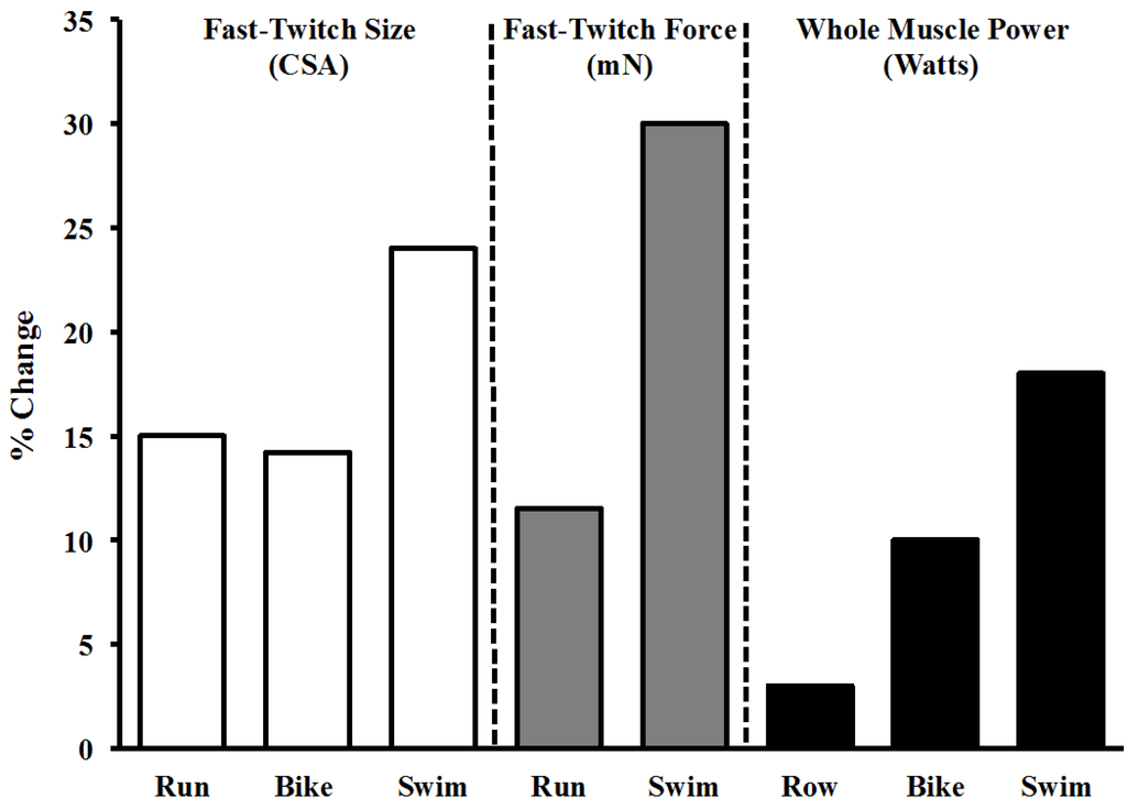 Numerous studies spanning various exercise modes and subject populations [21,41,42,43] have since corroborated the original findings [4] of increased muscle power with taper in endurance athletes (Figure 3). Taper-derived muscle power gains may occur in two phases (early and late) which reinforces that a taper should be of adequate length (generally ≥2 weeks) [43]. One might predict the main effect of tapering in endurance athlete’s muscle would be targeted to the highly aerobic slow-twitch muscle fibers. However, it is the less abundant and 5–8 times more powerful fast-twitch fibers that drastically respond [5,22,26,28]. These fibers grow at an alarmingly fast rate with taper [5,22,26], improving power output without a measurable change in body mass [5,22]. Improved fast-twitch fiber function may allow for a harder “push” to the finish line or improve economy (faster speed with the same amount of effort). It has recently been shown that favorable regulation of molecular hypertrophy markers, specifically in fast-twitch fibers, may support the high rate of growth in these fibers with tapering [6]. Although taper has a positive effect down to the molecular level, taper-mediated growth is only realized when volume is adequately reduced [11]. To our knowledge, data on the mechanisms of performance enhancement with tapering in strength or power athletes are not available at the muscle cell level. However, strength and power training can selectively hypertrophy fast-twitch muscle fibers [6], potentially maximizing growth adaptation before tapering ensues. Thus, tapering likely augments performance in intermittent-type athletes by a different mechanism than in endurance athletes.
