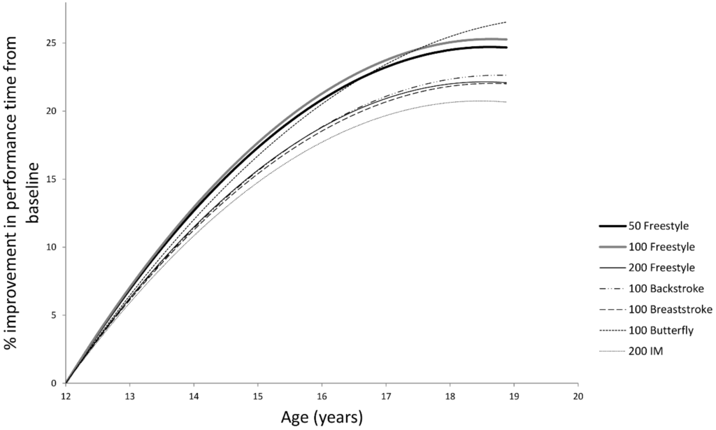 Separating the performance gains as a result of the combined effects of maturation and training interventions remains an elusive goal for sports scientists. This is the first study that has attempted to model the progression of sub-elite adolescent male swimmers’ performances across a multitude of individual strokes and distances. These models have identified that swimmers improve at different rates and achieve peak performances at different ages in different events ranging from 18.5 and 19.6 years of age. Assessing the gap between reaching biological maturity and peak performance should however continue to be an area of interest to the research community. Effectively identifying the potential “trainability” of young but mature athletes could hold the key to further improvements in athletic performance, especially in late specialisation sports, such as swimming.