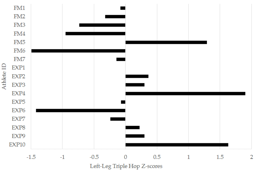 Figure 3. Individual left-leg triple hop z-scores for freshmen (FM) and experienced (EXP) players from a Division I collegiate men’s soccer team.