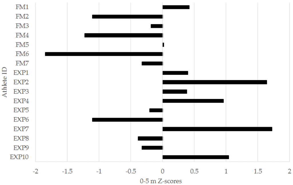 Figure 4. Individual 0–5 meter (m) sprint z-scores for freshmen (FM) and experienced (EXP) players from a Division I collegiate men’s soccer team.