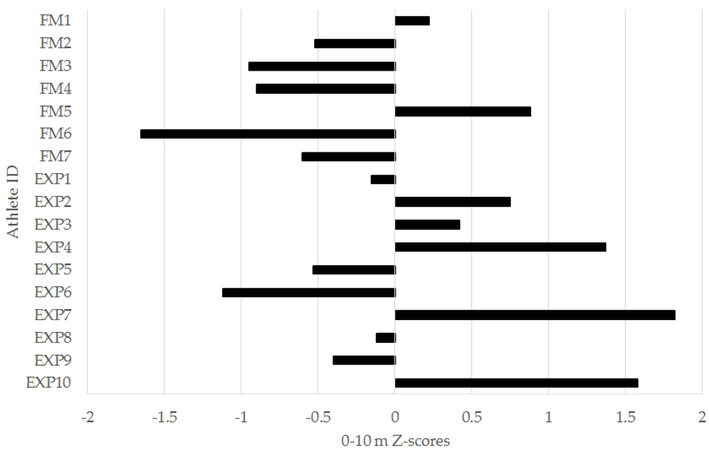 Figure 5. Individual 0–10 meter (m) sprint z-scores for freshmen (FM) and experienced (EXP) players from a Division I collegiate men’s soccer team.