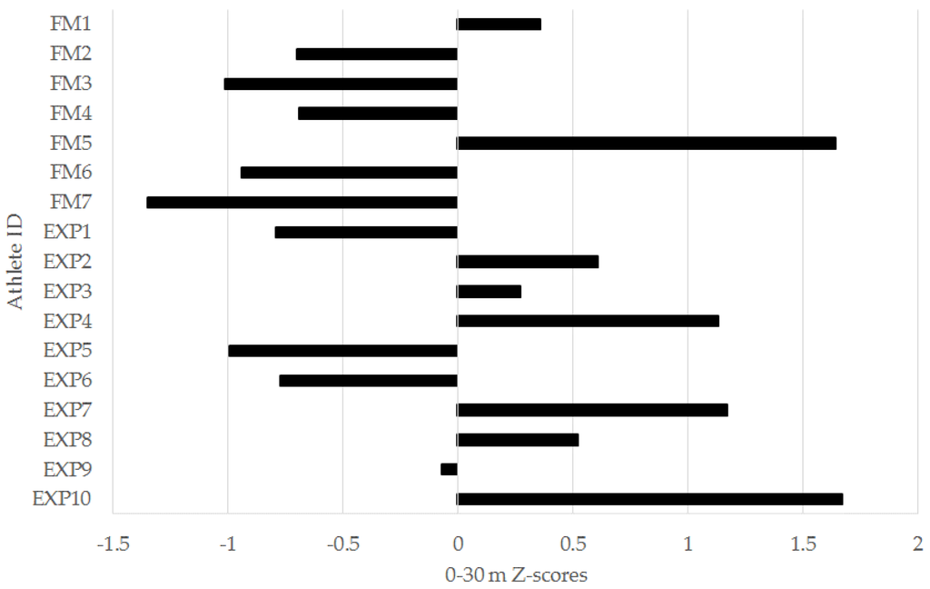 Figure 6. Individual 0–30 meter (m) sprint z-scores for freshmen (FM) and experienced (EXP) players from a Division I collegiate men’s soccer team.