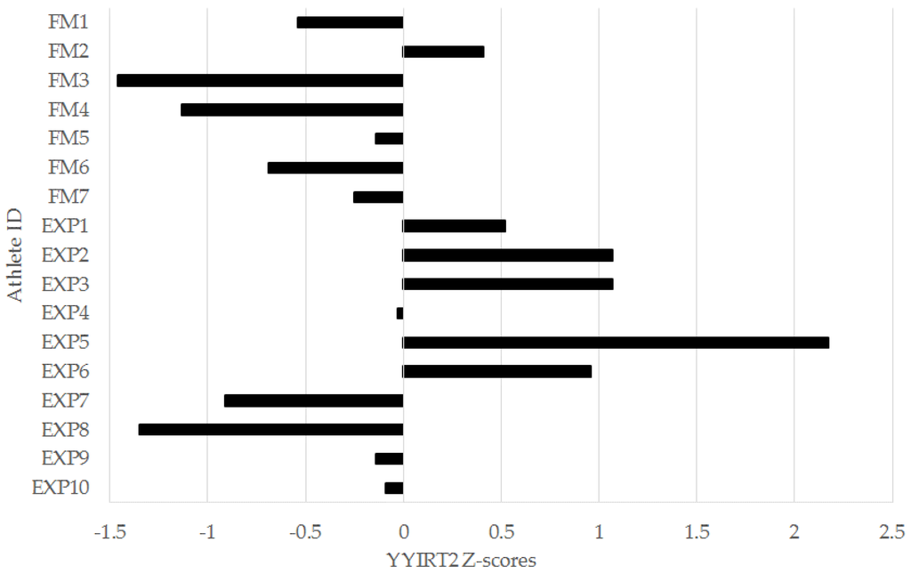 Figure 7. Individual Yo-Yo Intermittent Recovery Test Level 2 (YYIRT2) sprint z-scores for freshmen (FM) and experienced (EXP) players from a Division I collegiate men’s soccer team.