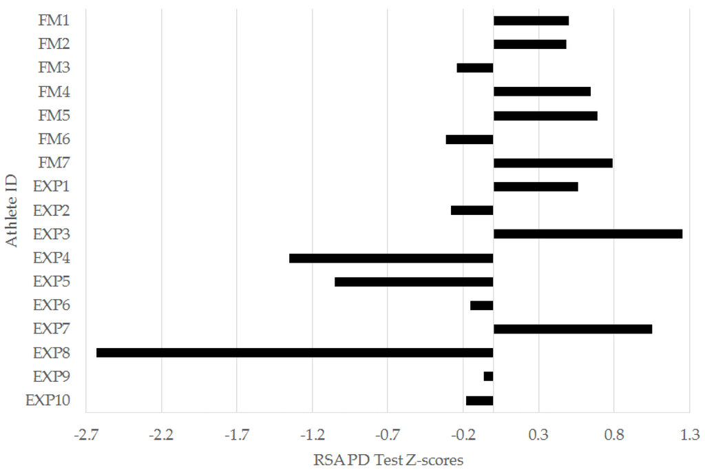 Given the results from the 30-m sprint, it could be expected that there would also be differences in the RSA TT when comparing the freshmen and experienced groups. This is because a higher maximal sprinting velocity has been related to lower total times in RSA tests conducted on elite Norwegian [37] and Brazilian [38] male soccer players; however, this was not the case in this research (Table 2 and Table 3). The experienced players did have a worthwhile difference above the squad mean for RSA PD (Table 3 and Figure 8), which suggested a greater percentage time drop-off from the first to last sprint. Indeed, one experienced player had a large RSA PD z-score of −2.63. These data could potentially relate to a higher sprinting speed (and, thus, lower sprint time) achieved in the first sprint, which is understandable given the moderately [23,24,33] faster 30-m sprint time achieved by experienced players in the linear speed test (Table 2). Nonetheless, the difference in RSA PD was not significantly different to that from the freshmen group (Table 2 and Table 3). The results from this study suggest that the RSA test conducted did not differentiate between freshmen and experienced collegiate men’s soccer players from this study.