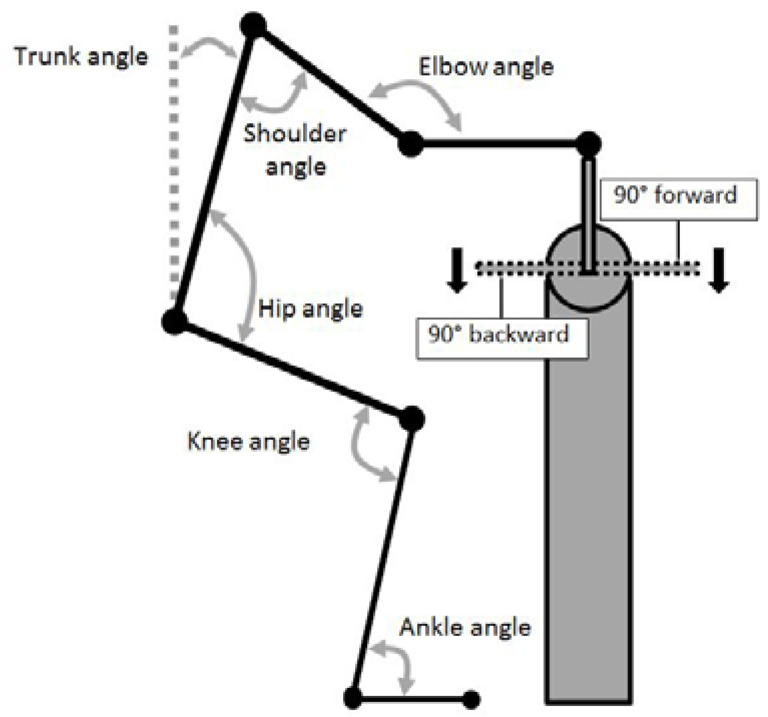 Full body sagittal plane motion was recorded using a video camcorder (Sony DCR-TRV120E, Sony Corporation, Tokyo, Japan) recording at 50 fields/s with a 1/500 shutter speed. To aid digitisation, markers were placed on the distal head of the fifth metatarsal bone, lateral malleolus of the ankle, lateral condyle of the tibia, greater trochanter, lateral aspect of the acromion process, lateral epicondyle of the humerus, and the styloid process of the ulna. Two-dimensional sagittal plane relative joint angles in degrees (°) were obtained through digitisation using APAS (Ariel Dynamics, Trabuco Canyon, CA, USA) for the ankle, knee, hip, shoulder, and elbow (Figure 3). Shoulder angle was measured using the trunk as a relative 0° position, with a positive value moving anteriorly into flexion. Trunk angle was measured relative to vertical, with a positive value indicating the shoulder was anterior to the hip. Kinematic data were summarised using four reference points during the grinding cycle based on handle position: 0° = handle vertically above the point of rotation (hub); 90° = horizontal to the hub, moving from 0° in the direction of rotation (on the sailor’s side of the pedestal for forward grinding, away from the sailor for backward); 180° = vertically below the hub; 270° = horizontal to the hub, on the way back up towards the 0° position.
