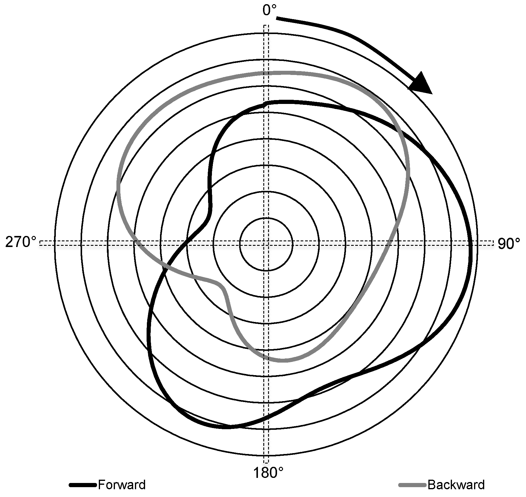 Average torque-angle curves for forward (black) and backward (grey) grinding. Torque increases as the traces move away from the centre (lines = 10 Nm increments). Arrow indicates the direction of handle rotation. 0° = crank handle vertically upwards from the centre.