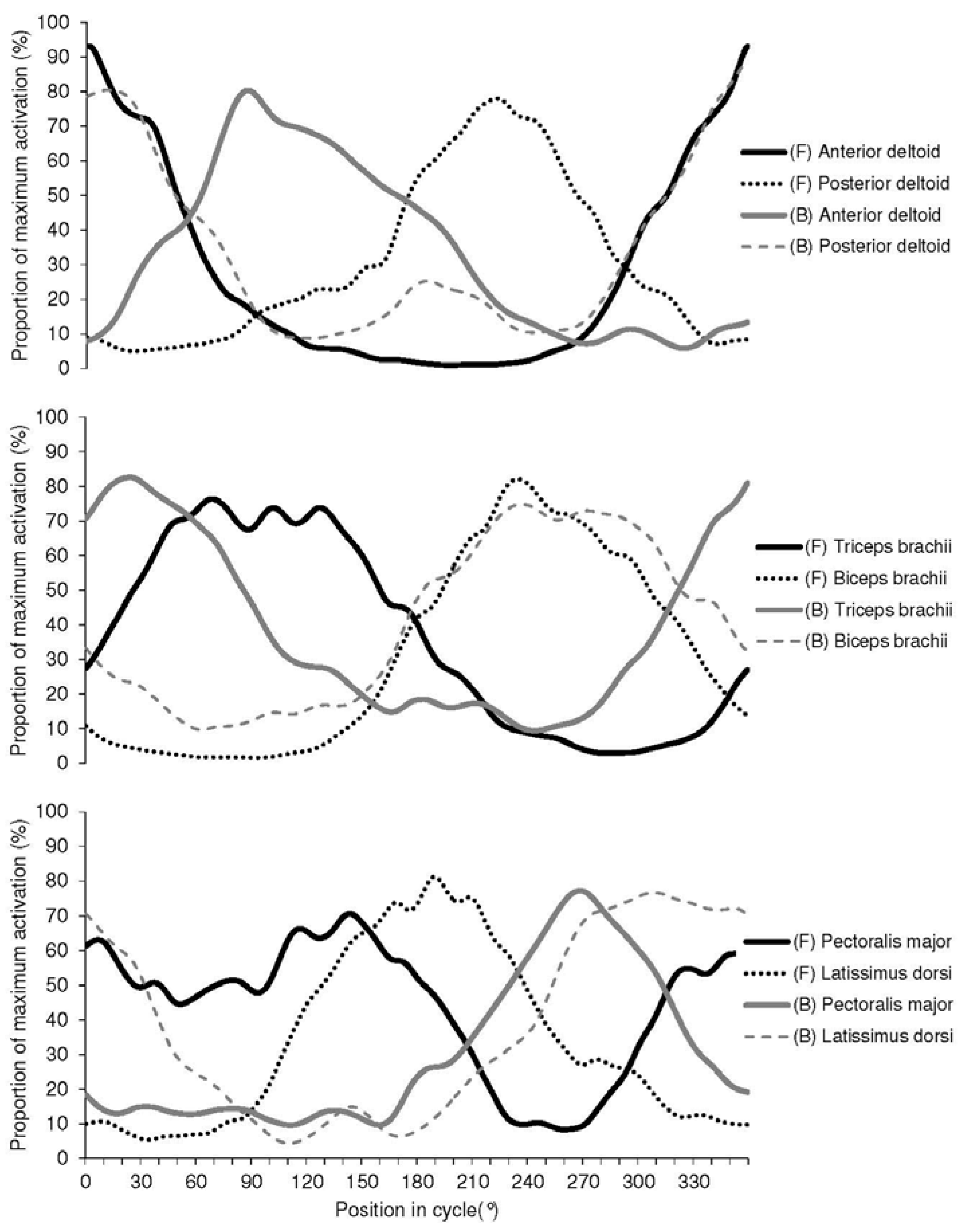 Relative levels of torque throughout the rotation were also reflected in muscle activation patterns. On an individual basis muscle activation patterns were consistent with the bi-phasic nature of grinding with distinct periods of activation and in-activation, which has also been seen previously in seated arm cranking [19]. However, the spread of muscles active at any one time differed with grinding direction, with more consistent contributions from the muscles examined (most notably latissimus dorsi and pectoralis major) throughout the forward grinding cycle compared to backward.