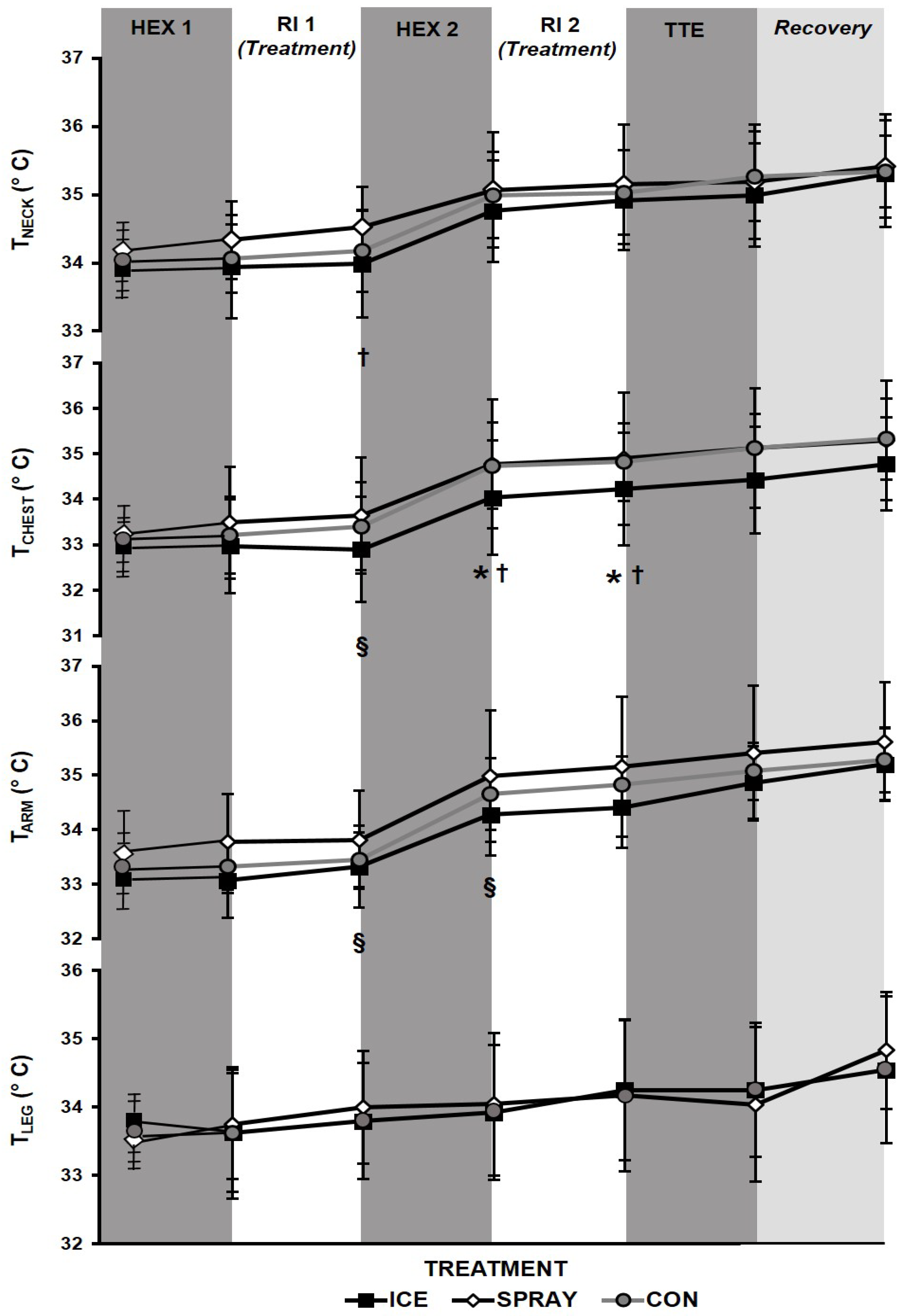 Skin temperatures (TNECK, neck; TCHEST, chest) during exercise bouts (HEX: high-intensity exercise interval; TTE: time-to-exhaustion) with intermittent rest intervals (RI) and neck cooling treatments (ICE: “wet ice” bag; SPRAY: non-thermal cool spray; or CON: control). Significance among treatments: * ICE vs. CON (p < 0.05), § ICE vs. CON (trend; p ≤ 0.08), † ICE vs. SPRAY (p < 0.05). Mean ± SD.