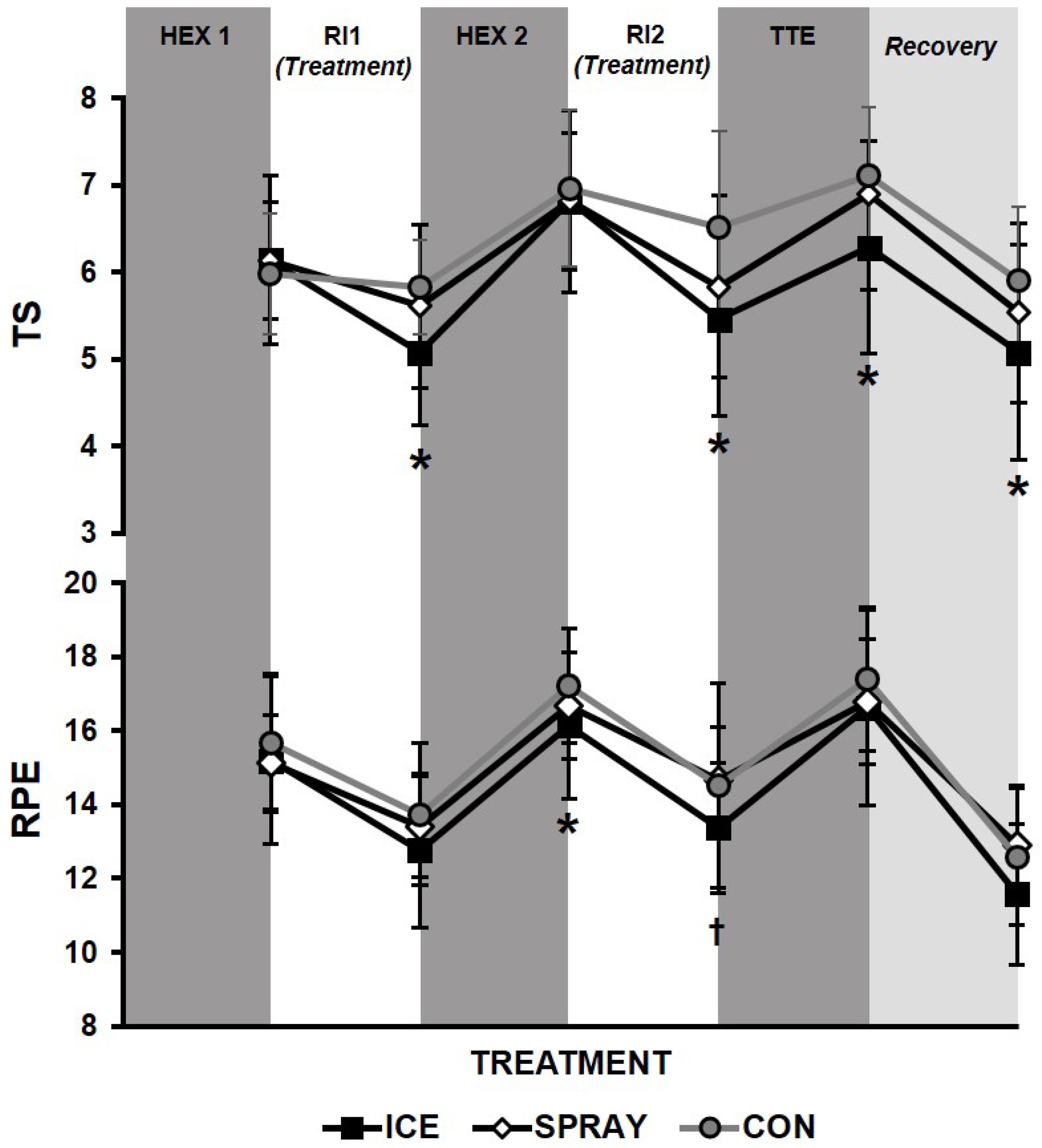 Perceptual responses to repeated exercise bouts (HEX: high-intensity exercise interval; TTE: time-to-exhaustion) with intermittent rest intervals (RI) and neck cooling treatments (ICE: “wet ice” bag; SPRAY: non-thermal cool spray; or CON: control). TS: thermal sensation; RPE: rating of perceived exertion. Significance among treatments: * ICE vs. CON (p < 0.05), † ICE vs. SPRAY (p < 0.05). Mean ± SD.