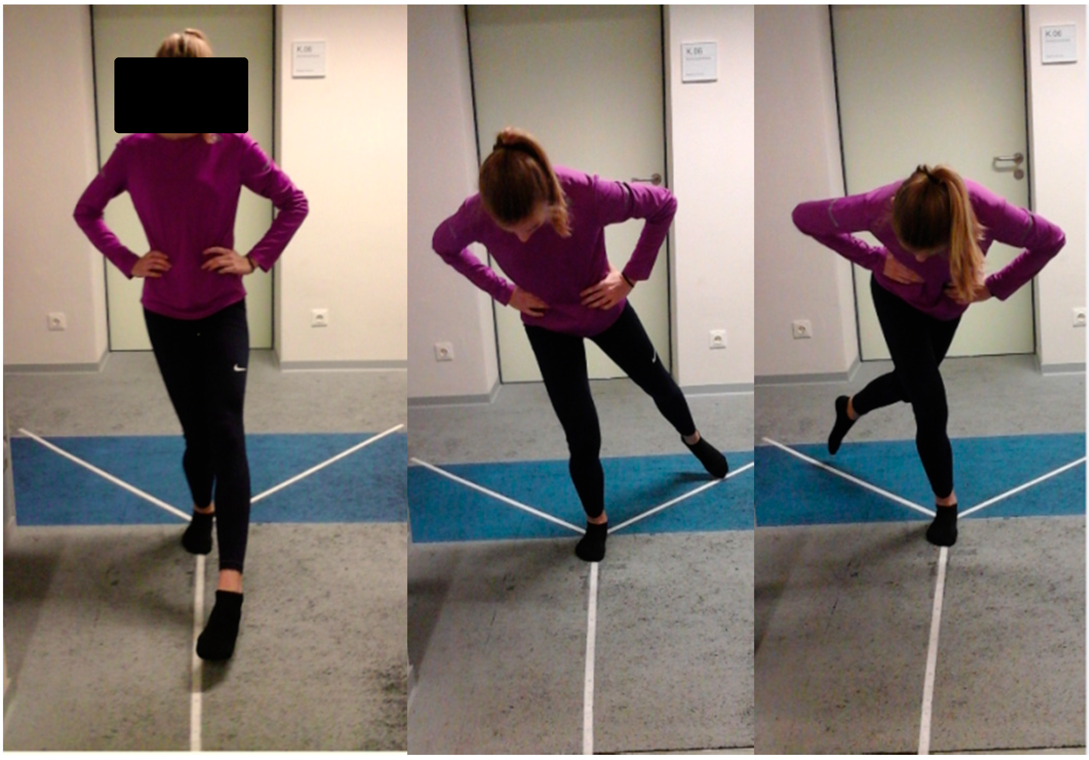 Age, gender, weight, height, number of training years, training days per week, training minutes per session and type of sports engaged in by subjects were recorded. Oral instructions, as well as a demonstration of how the test should be performed, were given to the participants. The SEBT directions were constructed by affixing 3 tape measures with a centimeter scale on the laboratory floor. The first reach direction was aligned anterior to the apex; the other two were oriented 135° to the first in posteromedial and posterolateral directions [24]. The order of the starting limb was randomized and the chronology of the directions was defined (1. Anterior; 2. Posteromedial; 3. Posterolateral). The subject’s starting foot is placed at the convergence of the reach directional lines of the SEBT [24]. In the process the lateral malleolus is positioned at the intersection point of the 3 directions with the foot’s longitudinal axis oriented at the anterior direction. The starting position is a bilateral stand. Subjects stood with socks while keeping their hands on their hips. Maintaining a single leg stance, they were instructed to reach out as far as possible with the non-stance limb along the marked tape, point to the most distal portion with their great toe and return the limb back to the starting position [25]. Subjects practiced each direction 4 times before the main test in order to minimize learning effect [23,26]. This was followed by the recording of 3 successful trials in each direction for both legs, always with a 10-s rest between each test [21]. The limb length of subjects was then taken with a measuring tape. This was defined as the distance from the anterosuperior iliac spine to the medial malleolus [27]. Maximum reach distance was visually read by the same examiner for all subjects. The examiner is a final year doctoral student with 5 years working experience as a physiotherapist and 4 additional years of working with young athletes as part of the doctoral studies. Prior to testing the examiner received training at the University of Potsdam Outpatient Clinic, a licensed medical examination center of the German Olympic Sports federation. A trial was considered invalid if the reaching foot did not return to the starting position, touched down while reaching out, the support limb shifted, the heel of the support foot did not stay in contact with the ground or if the hands were removed from the hips (Figure 1).