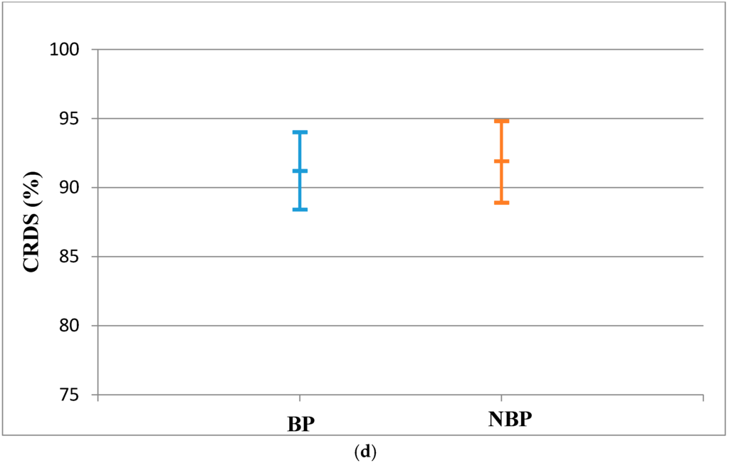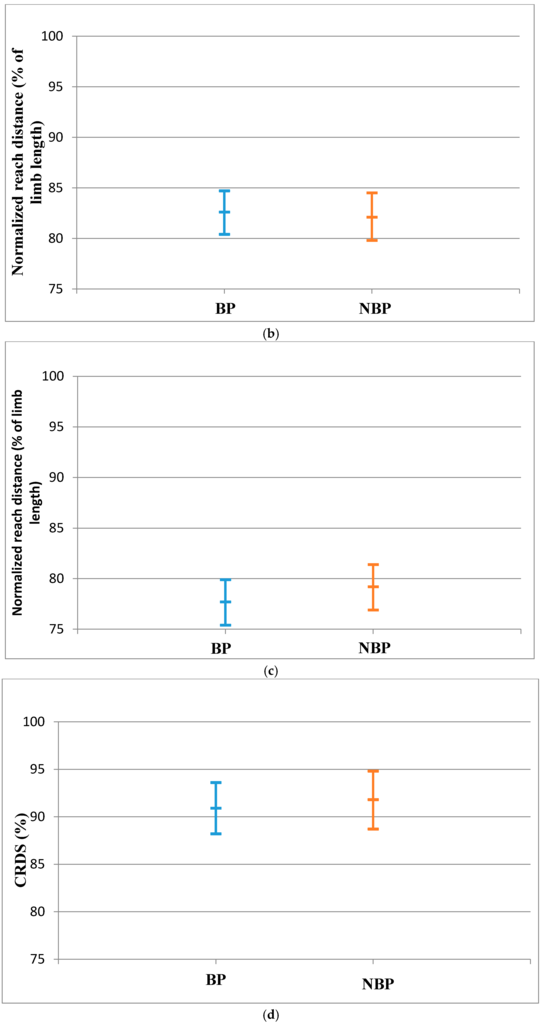 The reach distances and CRDS of the LLL for BP were not statistically significantly different from the NBP subjects. The effect sizes for the reach distances were also small (Table 4). There was also no significant evidence that the population means of the LLL for the BP and NBP young athletes are different as shown by the 95% confidence interval (Figure 3a–d).